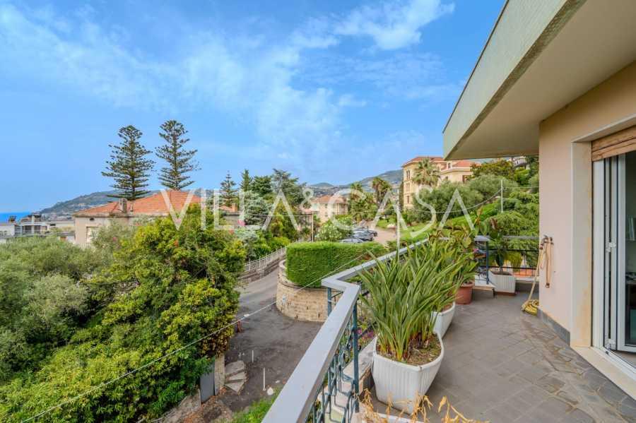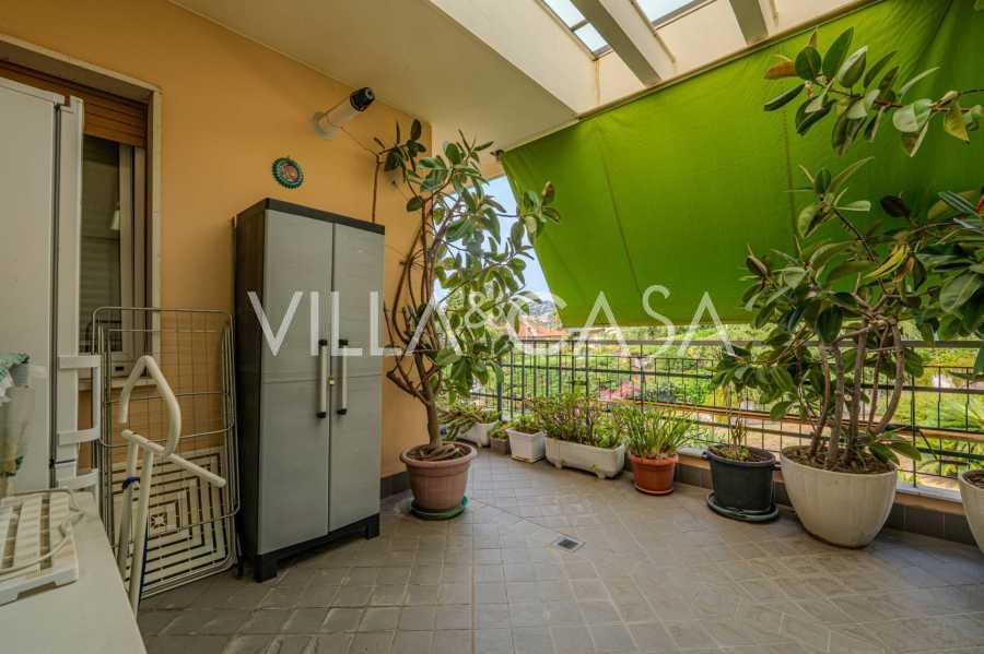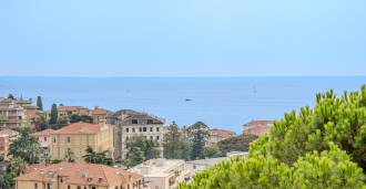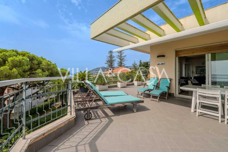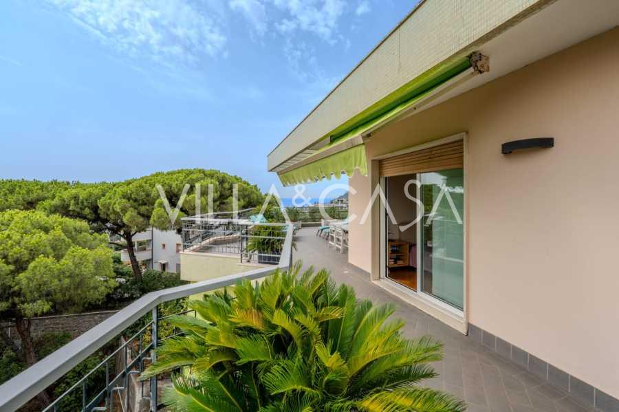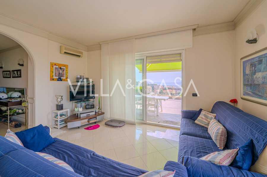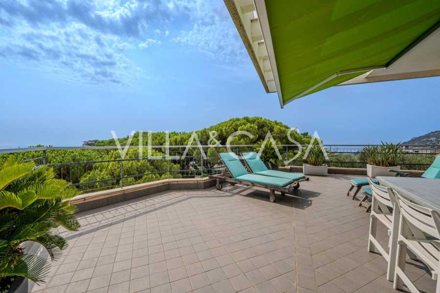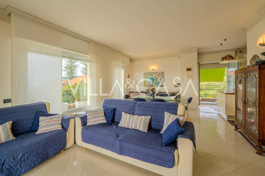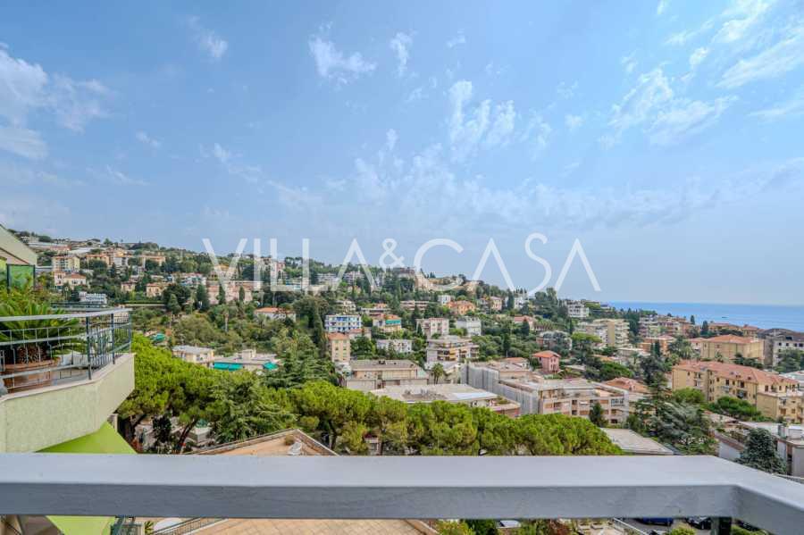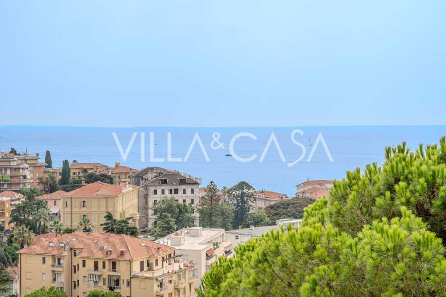 In vendita attico a Sanremo, a 10 minuti a piedi dal mare, con una superficie totale di circa 146 m². L'appartamento si trova al 5° piano di un edificio con ascensore e comprende: