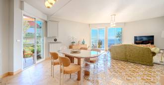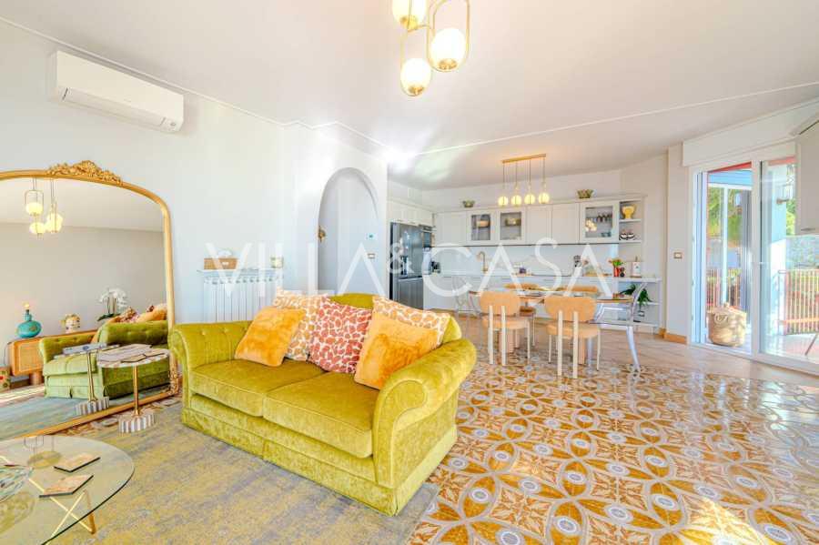 L'arredamento interno dell'appartamento combina comfort moderno con un'atmosfera di elegante accoglienza. Un ampio ingresso conduce a un magnifico soggiorno con cucina a vista, da cui si apre una vista mozzafiato sul mare. Dal soggiorno si accede a due balconi, dove è possibile godere della brezza marina e della vista sulla costa ligure.