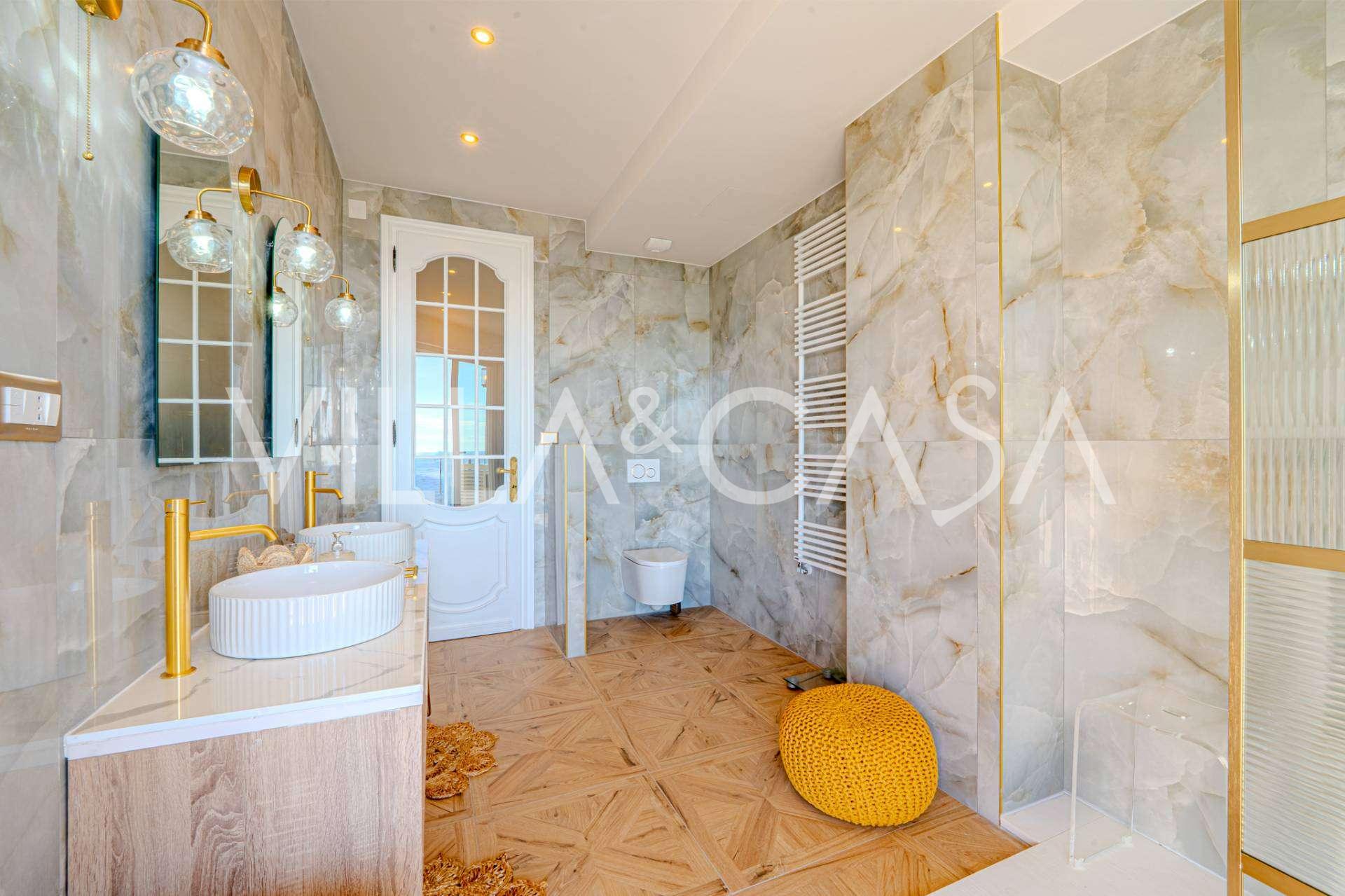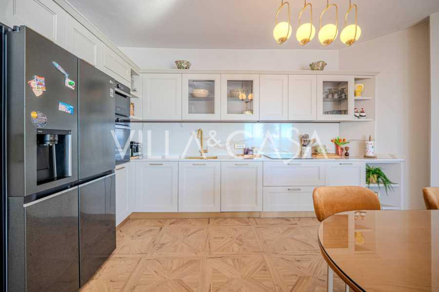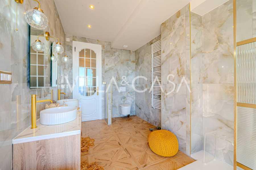 La disposizione include tre camere da letto, due delle quali hanno accesso diretto al balcone con vista mare, oltre a tre bagni rifiniti con materiali di alta qualità.