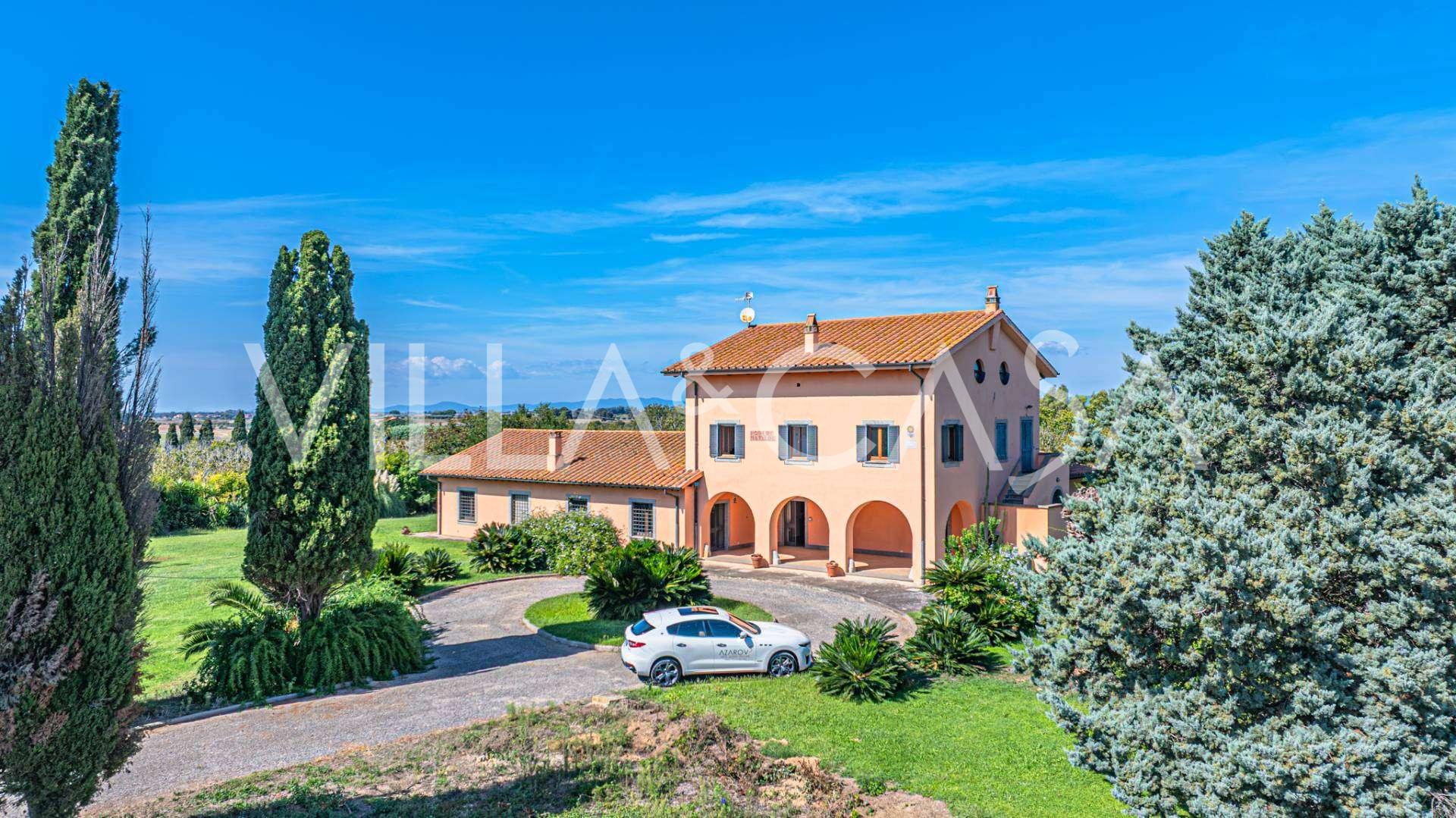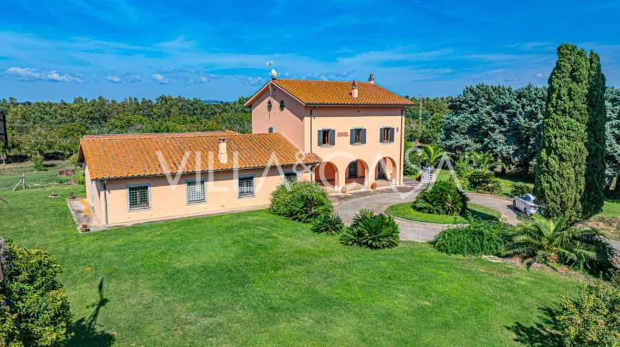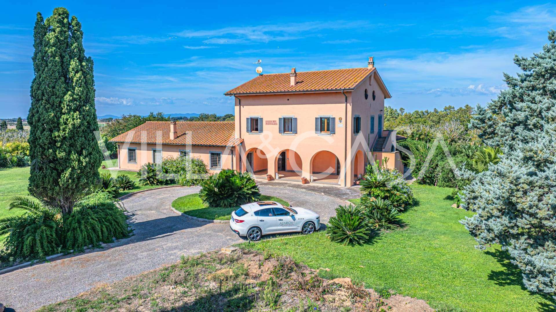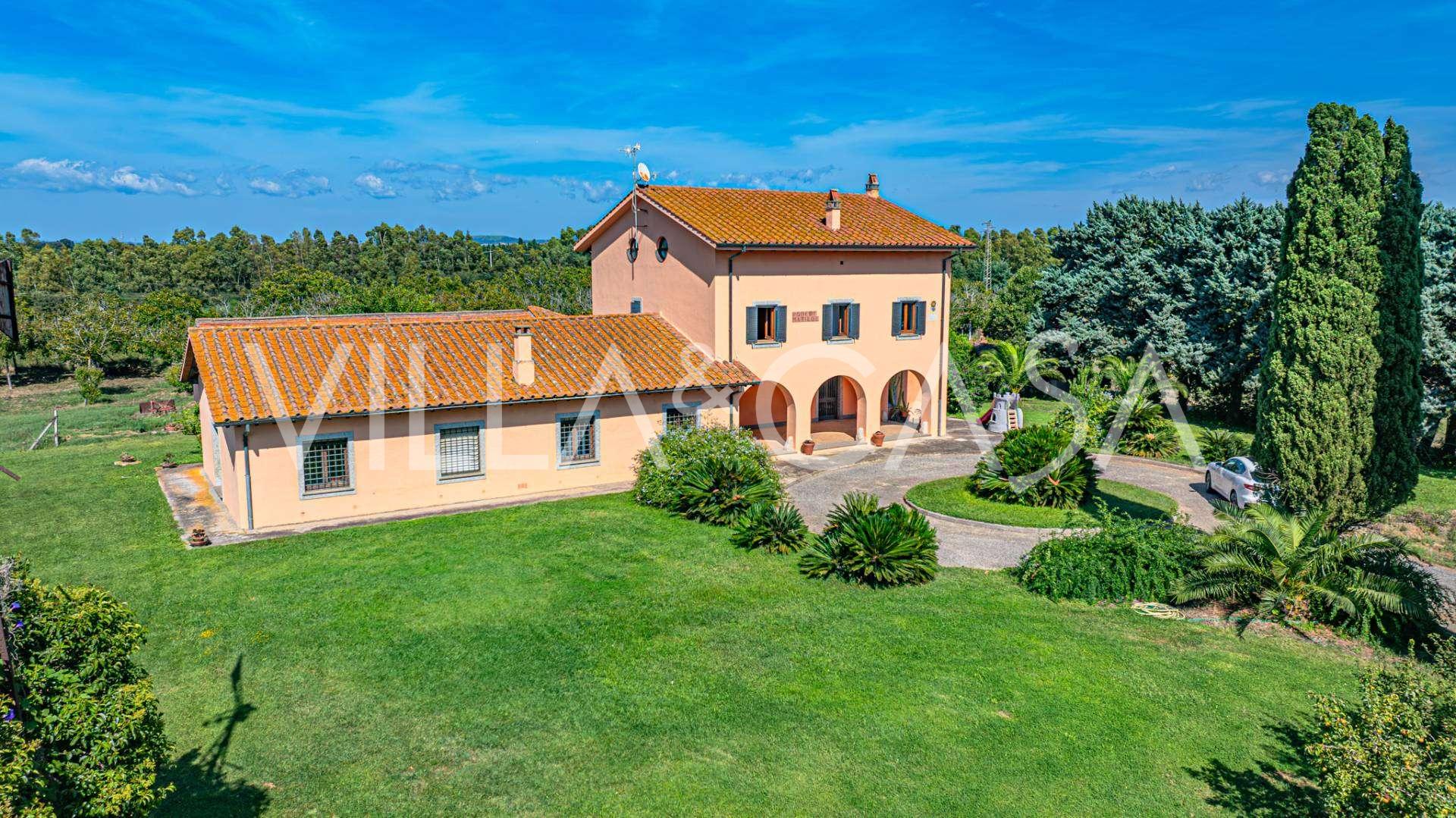 In vendita casale situato in una zona tranquilla della campagna di Tarquinia, a poche centinaia di metri dal mare, visibile magnificamente dai piani superiori. La casa è ben collegata con l'ambiente urbano e la zona costiera. Costruita nel 1942, è stata completamente rinnovata negli anni '90 utilizzando materiali tradizionali di altissima qualità e arredata con mobili artigianali su misura. La proprietà si estende su un terreno di oltre due ettari, circondata da un magnifico giardino con una varietà di piante: alberi da frutto, palme, ulivi, noci, vigneto, flora tropicale, arbusti, roseti e fiori rigogliosi.