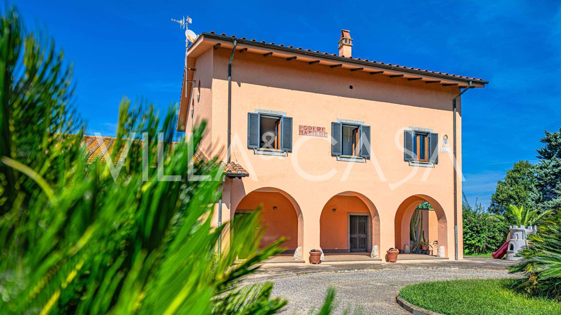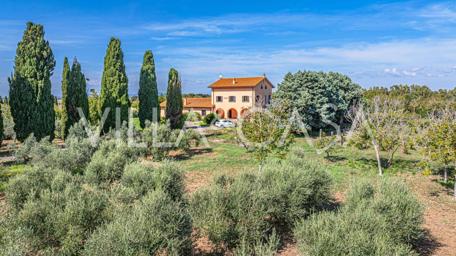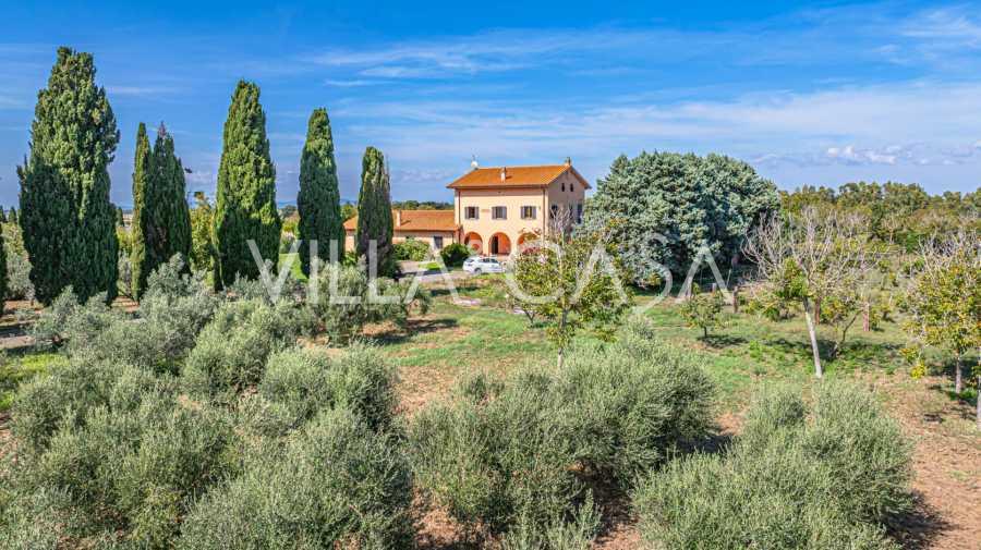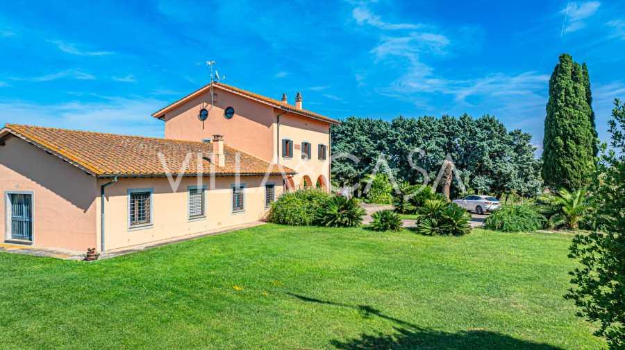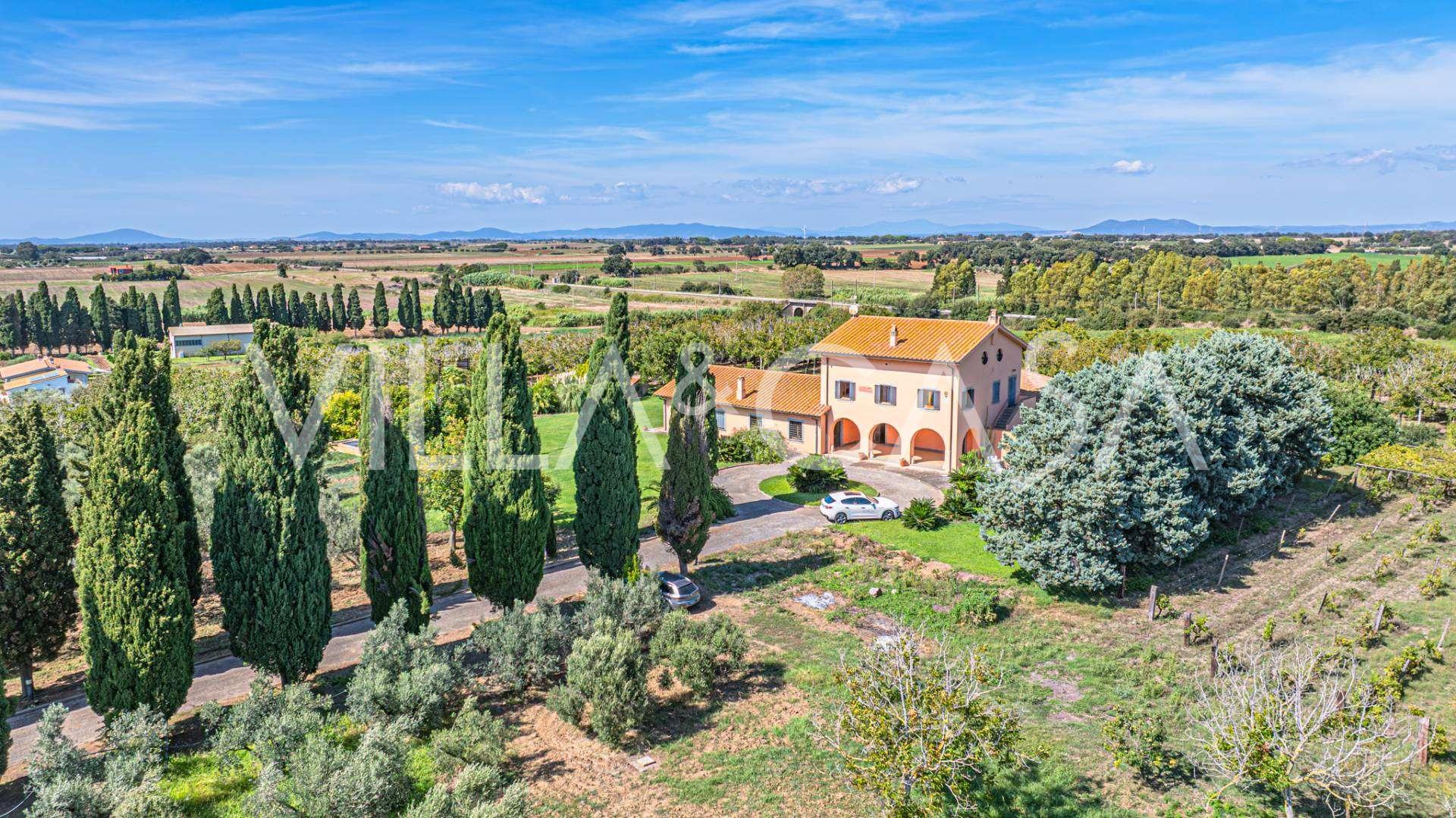 In vendita casale situato in una zona tranquilla della campagna di Tarquinia, a poche centinaia di metri dal mare, visibile magnificamente dai piani superiori. La casa è ben collegata con l'ambiente urbano e la zona costiera. Costruita nel 1942, è stata completamente rinnovata negli anni '90 utilizzando materiali tradizionali di altissima qualità e arredata con mobili artigianali su misura. La proprietà si estende su un terreno di oltre due ettari, circondata da un magnifico giardino con una varietà di piante: alberi da frutto, palme, ulivi, noci, vigneto, flora tropicale, arbusti, roseti e fiori rigogliosi.
