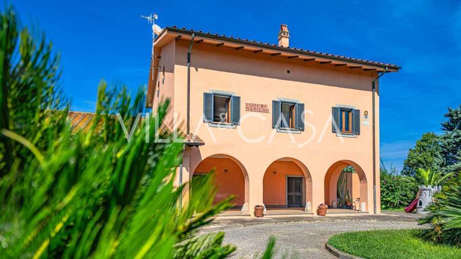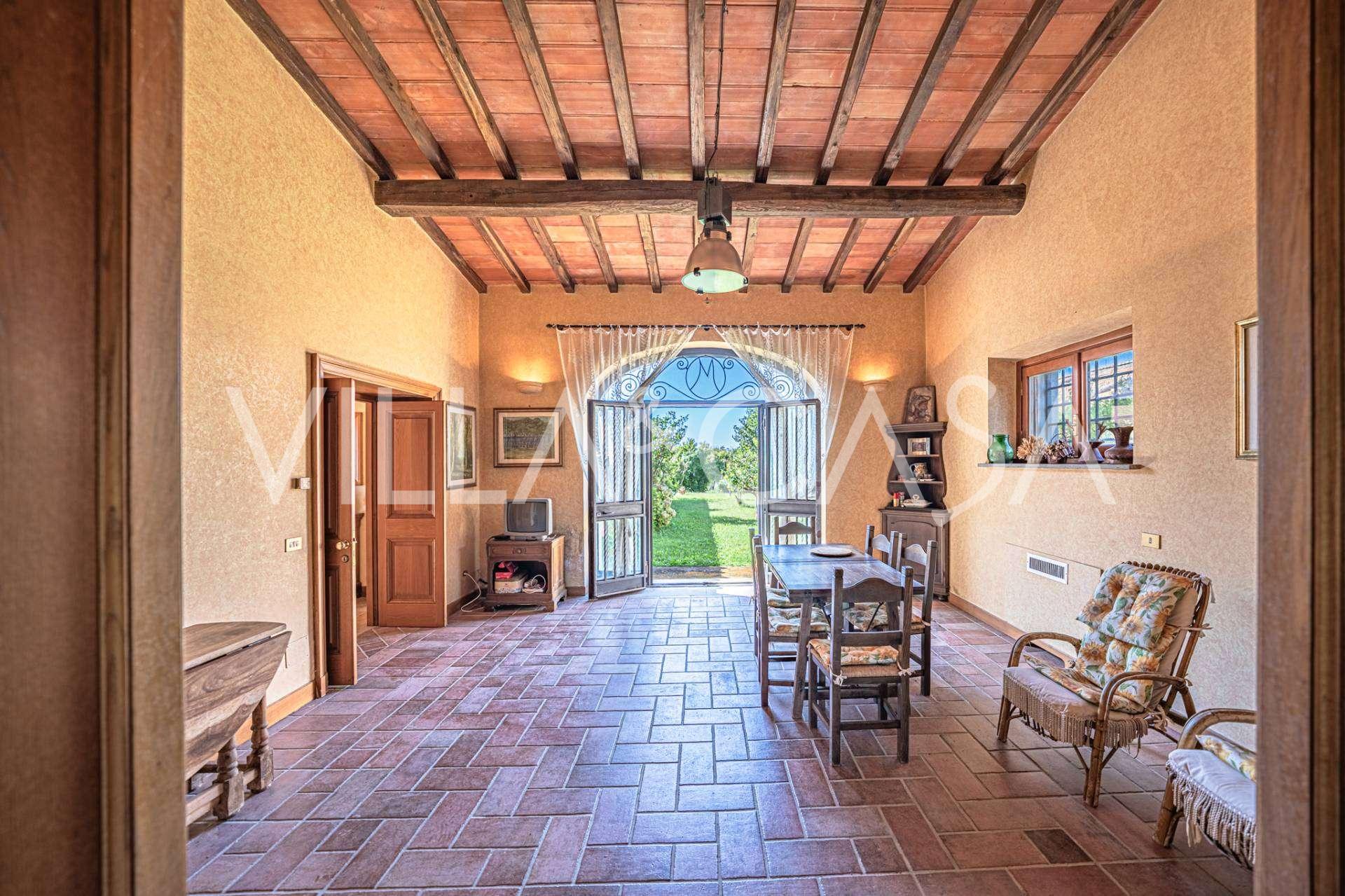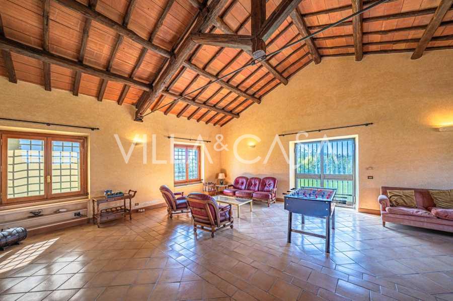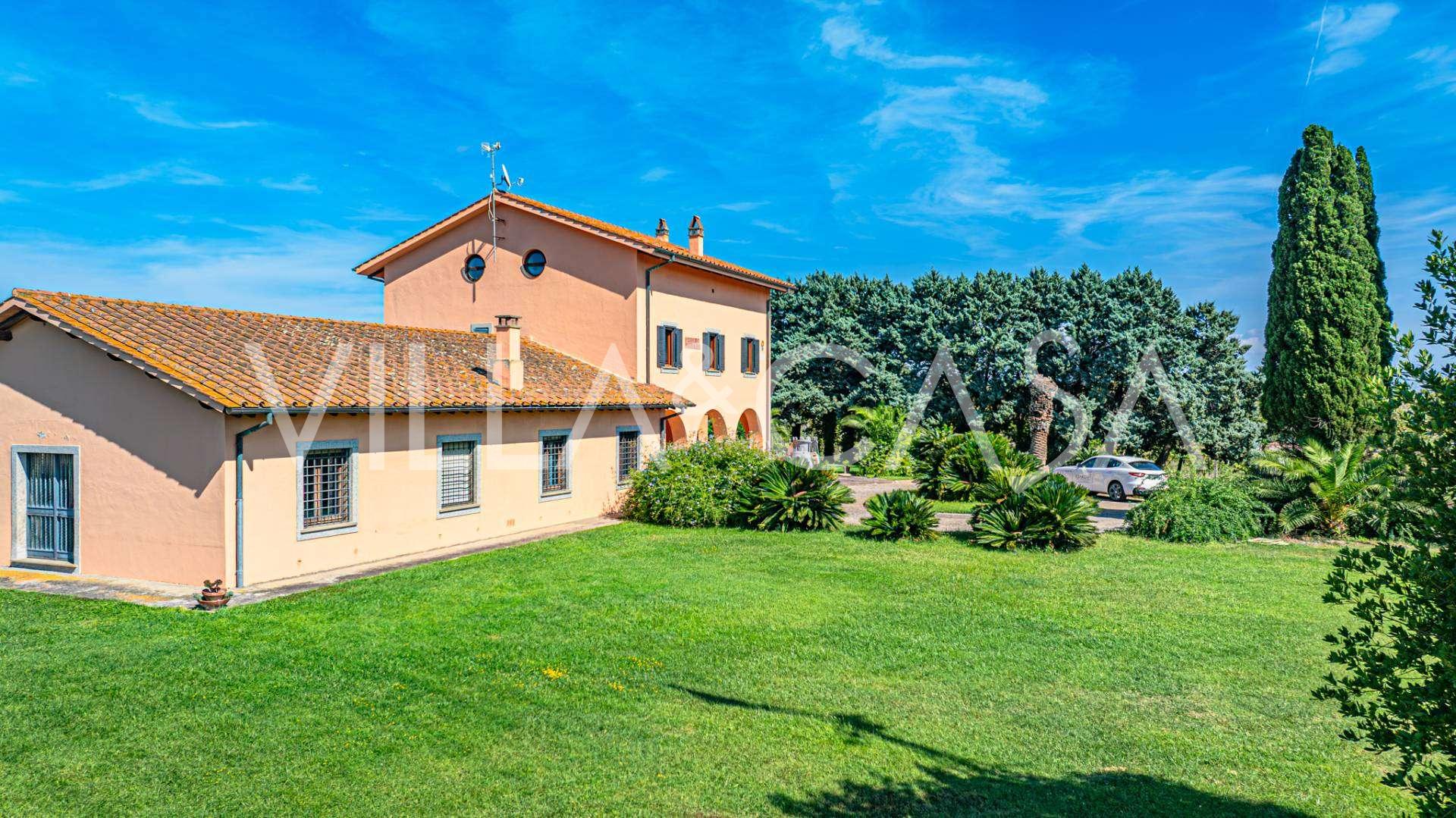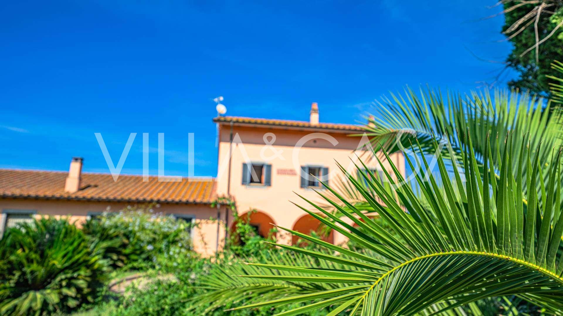In vendita casale situato in una zona tranquilla della campagna di Tarquinia, a poche centinaia di metri dal mare, visibile magnificamente dai piani superiori. La casa è ben collegata con l'ambiente urbano e la zona costiera. Costruita nel 1942, è stata completamente rinnovata negli anni '90 utilizzando materiali tradizionali di altissima qualità e arredata con mobili artigianali su misura. La proprietà si estende su un terreno di oltre due ettari, circondata da un magnifico giardino con una varietà di piante: alberi da frutto, palme, ulivi, noci, vigneto, flora tropicale, arbusti, roseti e fiori rigogliosi.