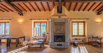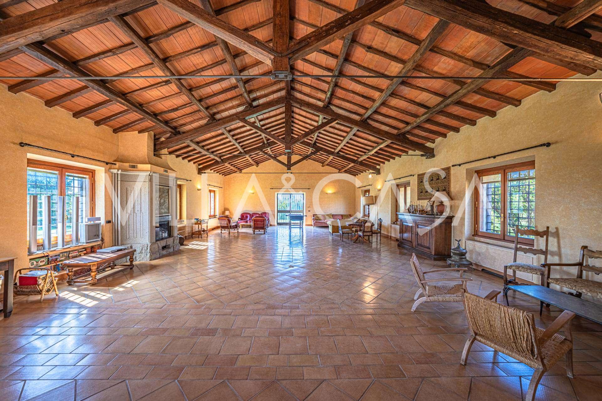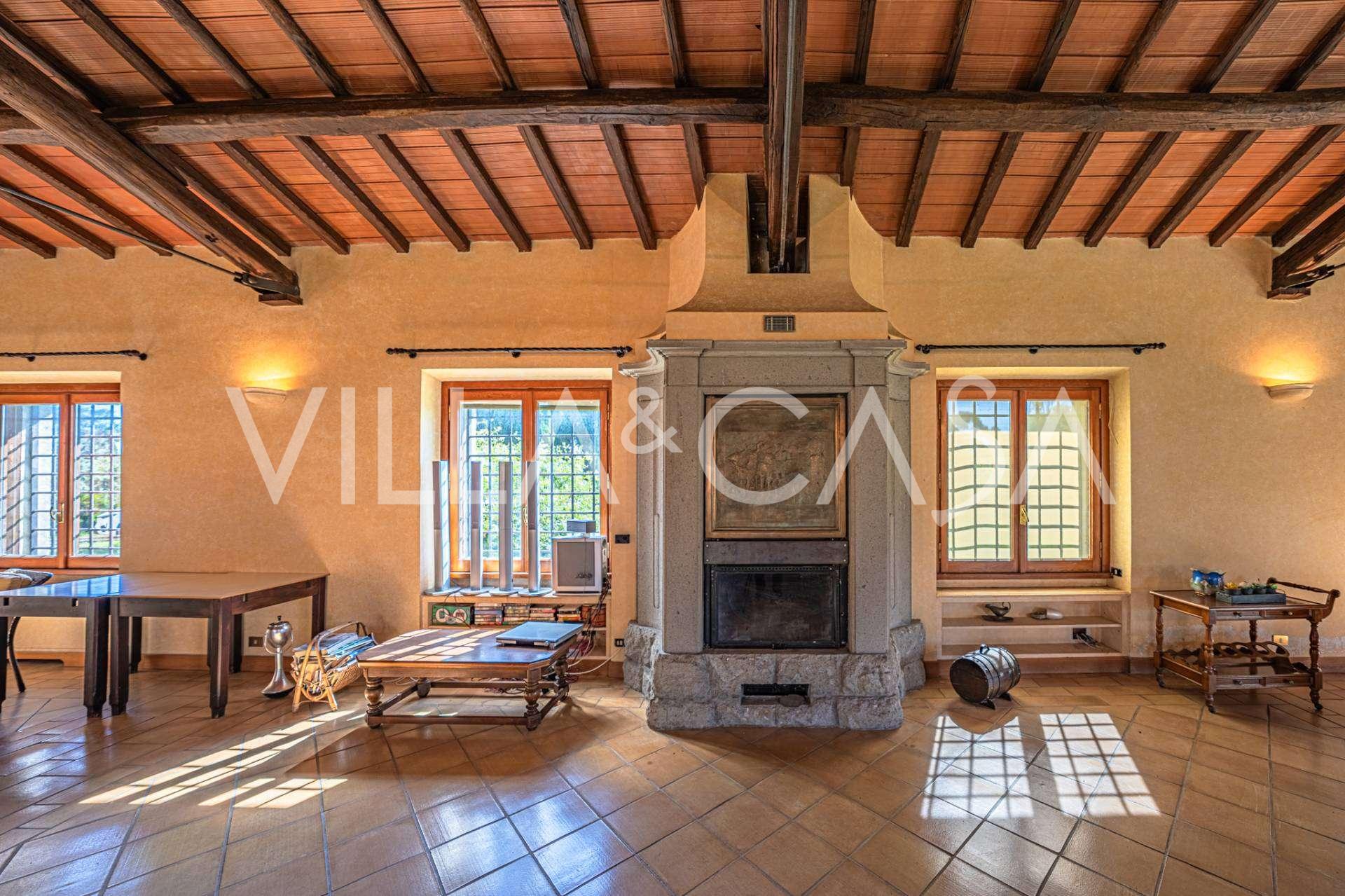 Al piano terra, che occupa circa 140 m², un tempo antica scuderia, si trova un ampio salone con travi in legno a vista, illuminato da numerose finestre con vista sul giardino. Il fulcro è un massiccio camino in raro marmo grigio peperino, realizzato da artigiani locali. Qui si trova anche una spaziosa cucina con area di preparazione, camino a legna e forno, oltre a una zona pranzo separata, un ampio ingresso, una camera da letto e due bagni.