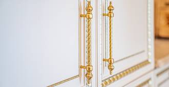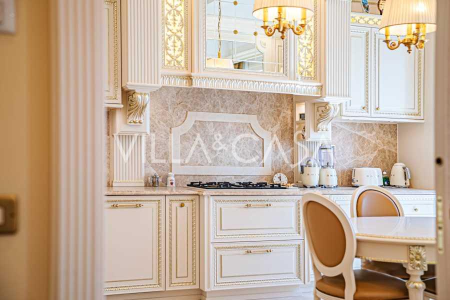 La cucina in stile Haute couture è realizzata su misura in legno selezionato e dotata di elettrodomestici premium Miele, Liebherr e Smeg; qui lo spazio aperto si armonizza con una lavanderia privata, elegantemente nascosta dietro una porta a specchio con intagli a mano.