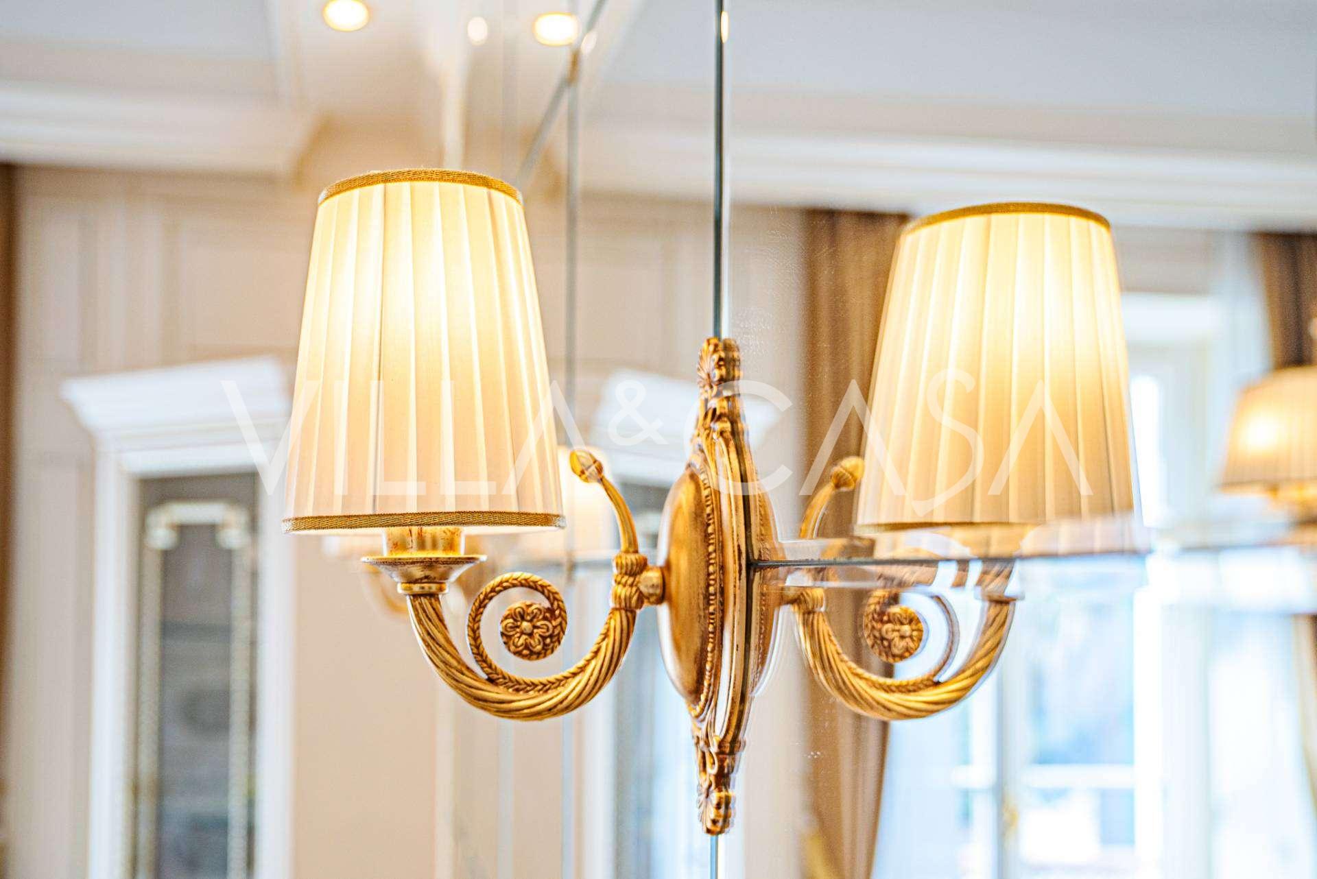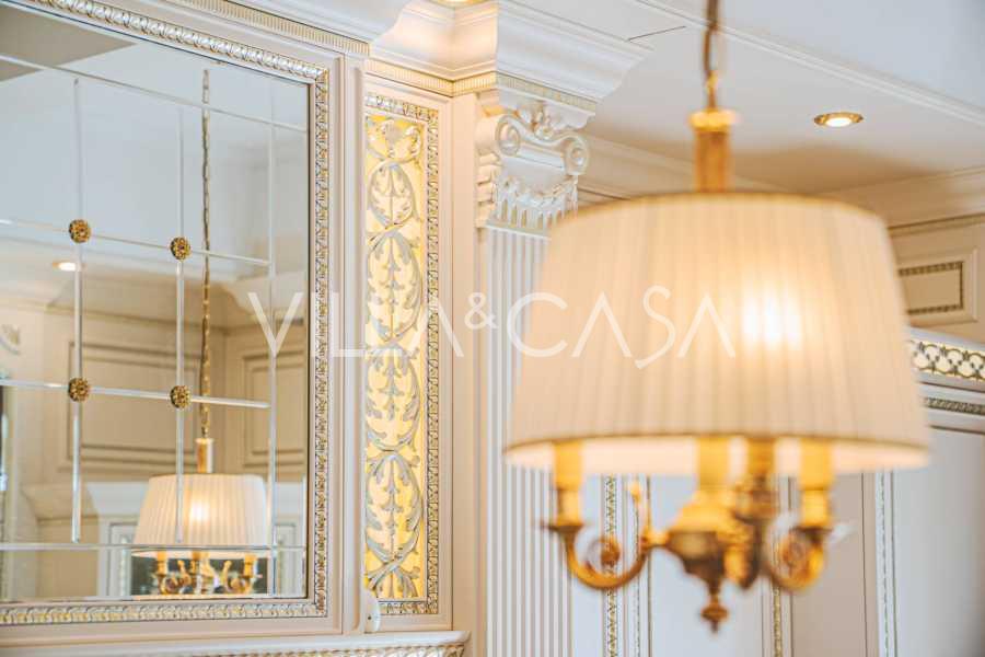 Ogni dettaglio dell'arredamento è un'opera d'arte: pareti in legno naturale, nabuk e pelle; parquet di alta qualità; stucco veneziano; porte e mobili unici di Bucalossi; design dell'illuminazione esclusivo — lampadari artigianali; quadri raffinati, creati su misura appositamente per questo spazio, che riflettono il colore di Ospedaletti. Finestre e gruppi di balconi sono realizzati su progetto speciale per il massimo comfort e isolamento termico.