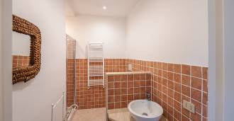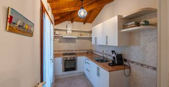 Terzo livello: salone con camino, cucina separata, due camere da letto, ripostiglio.