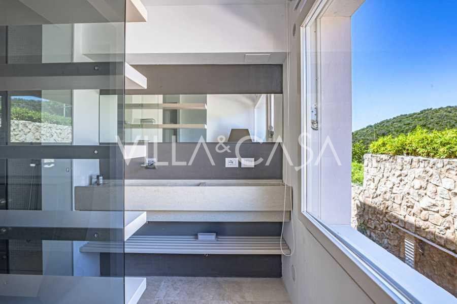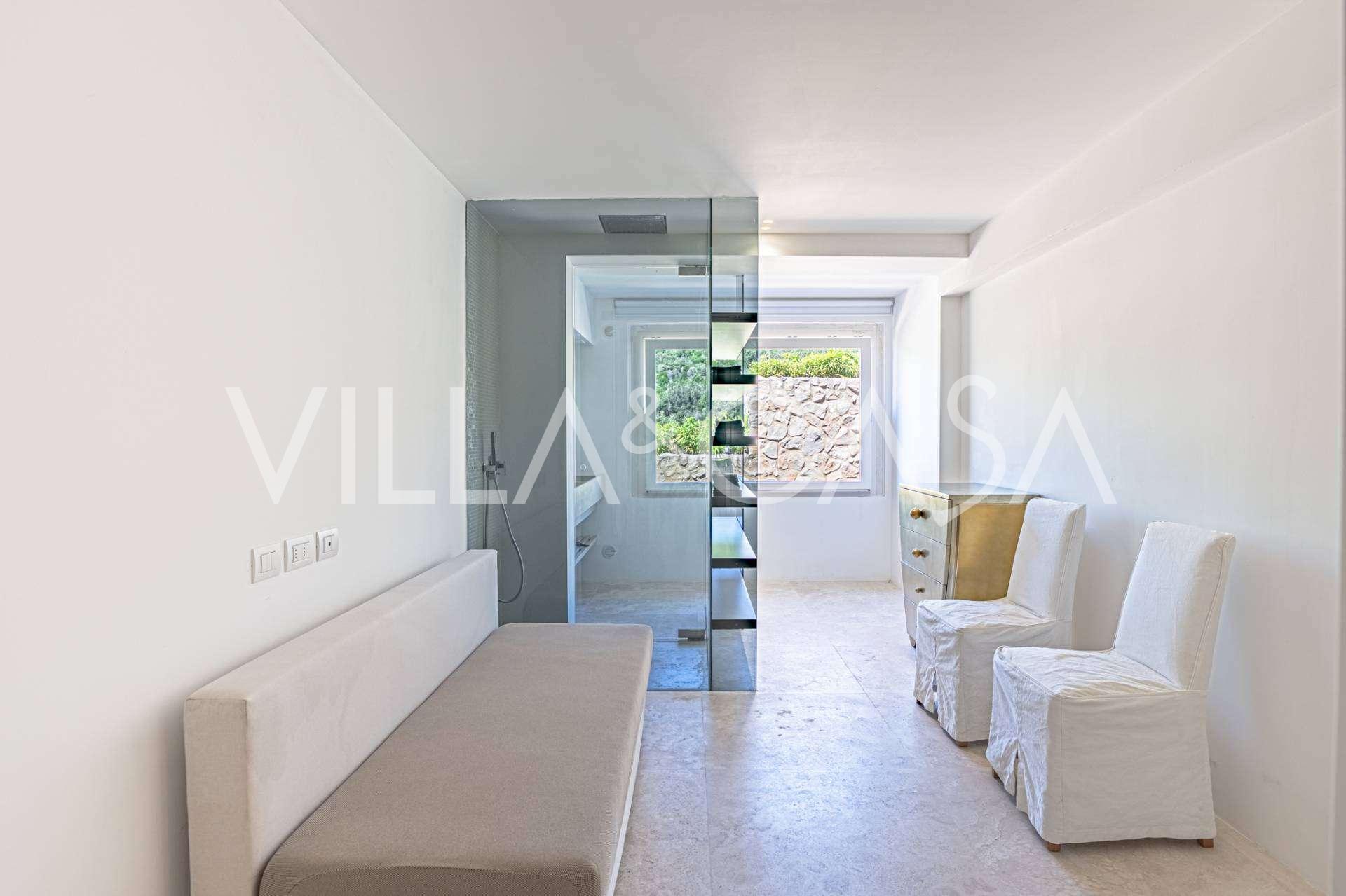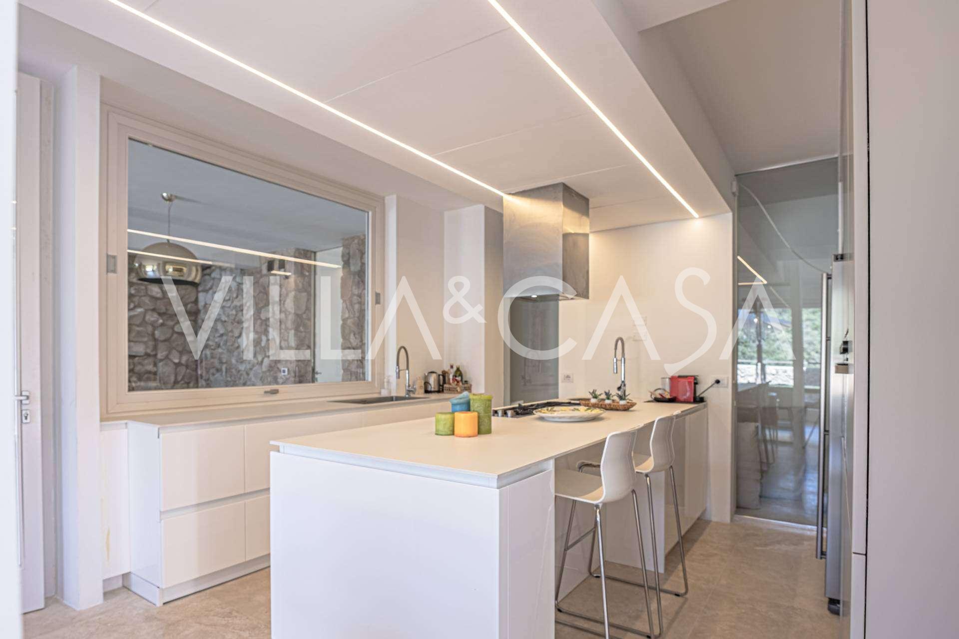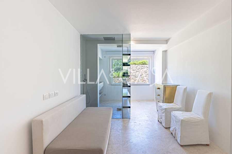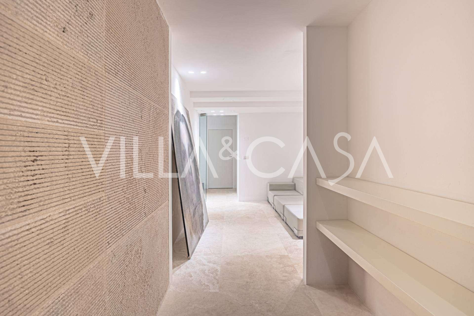La superficie totale degli interni è di 380 m². Al primo piano si trova una magnifica area di ricevimento con un ampio soggiorno che conduce a una grande terrazza da pranzo con vista sul mare, un raffinato salotto e una elegante sala da pranzo collegata a una cucina di alta classe completamente attrezzata.