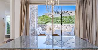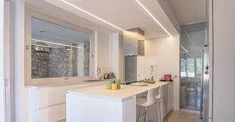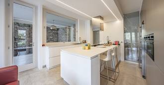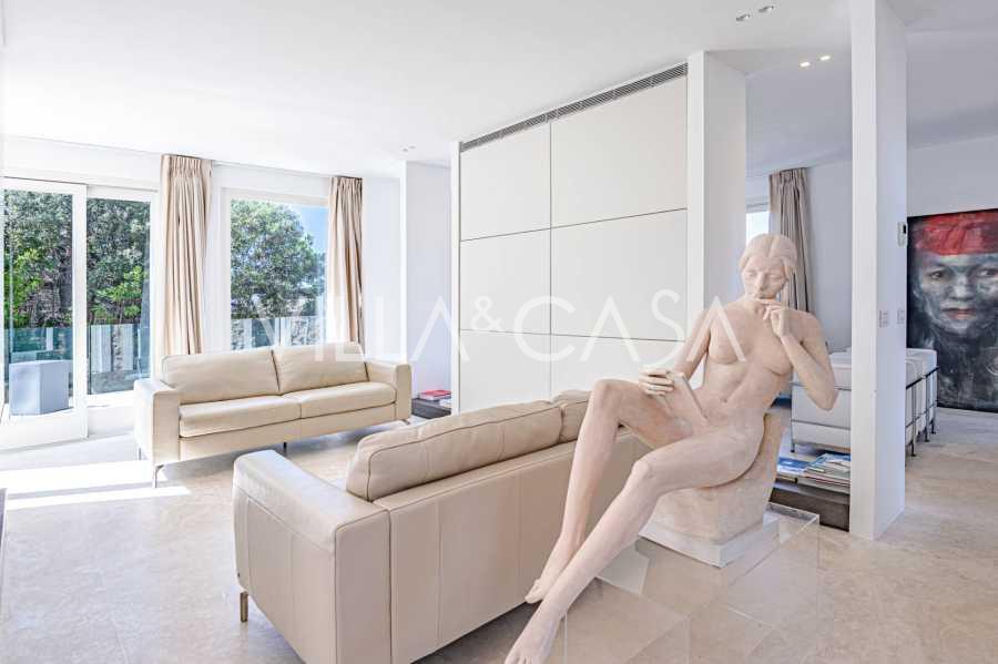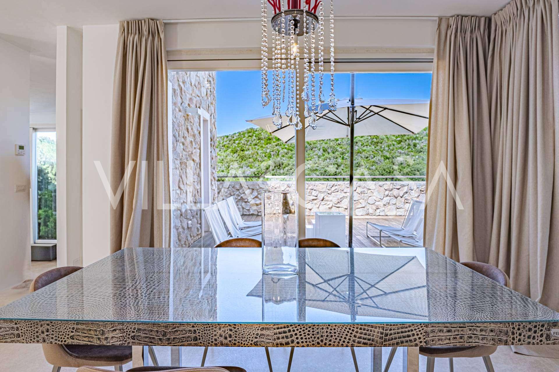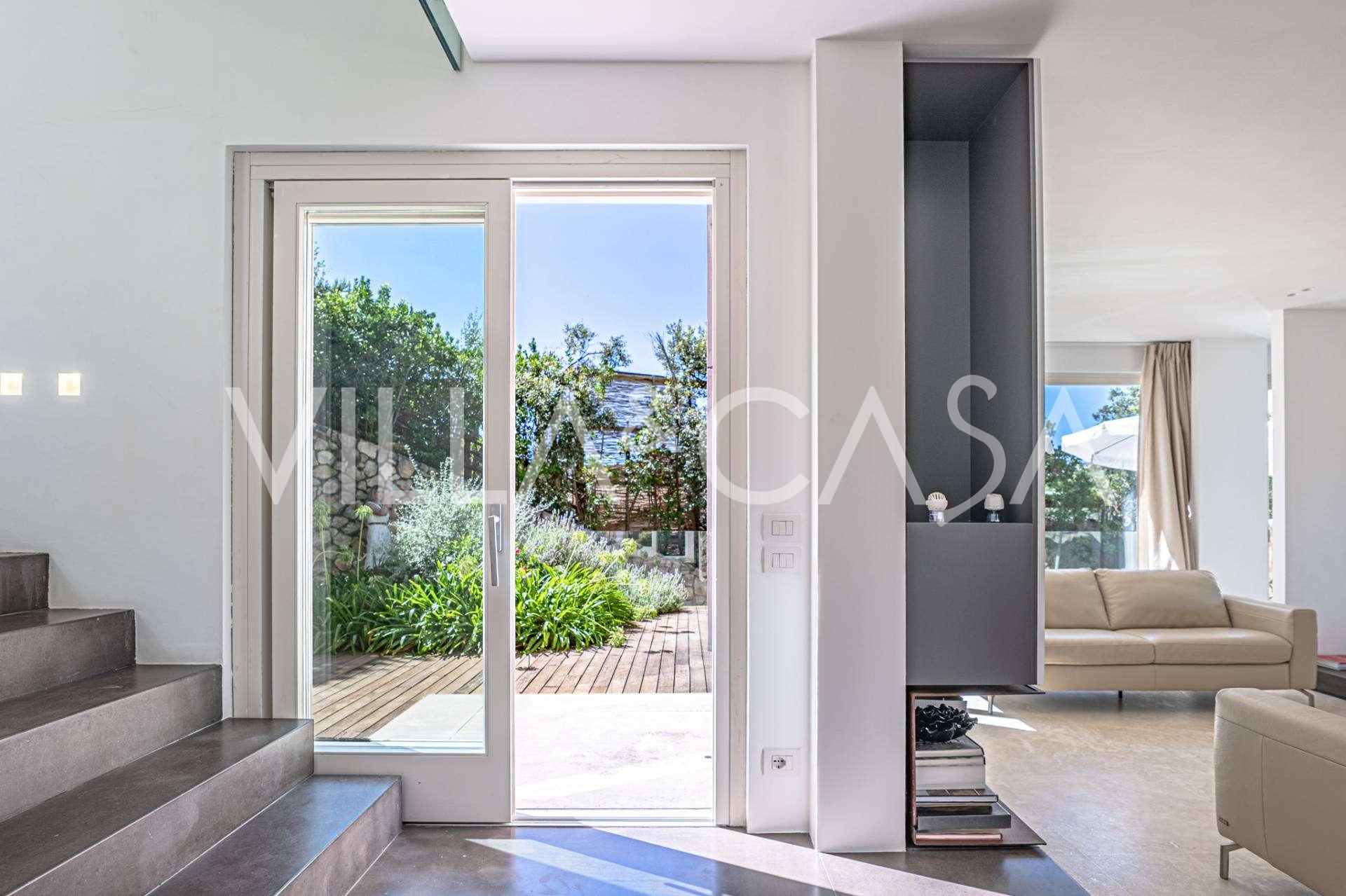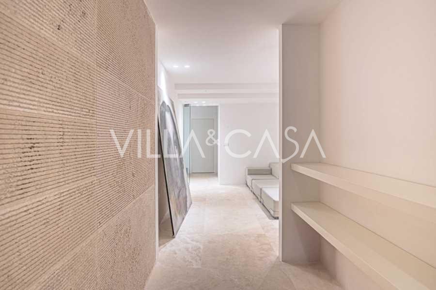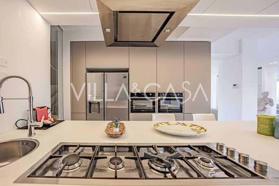 La superficie totale degli interni è di 380 m². Al primo piano si trova una magnifica area di ricevimento con un ampio soggiorno che conduce a una grande terrazza da pranzo con vista sul mare, un raffinato salotto e una elegante sala da pranzo collegata a una cucina di alta classe completamente attrezzata.