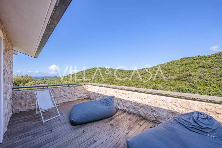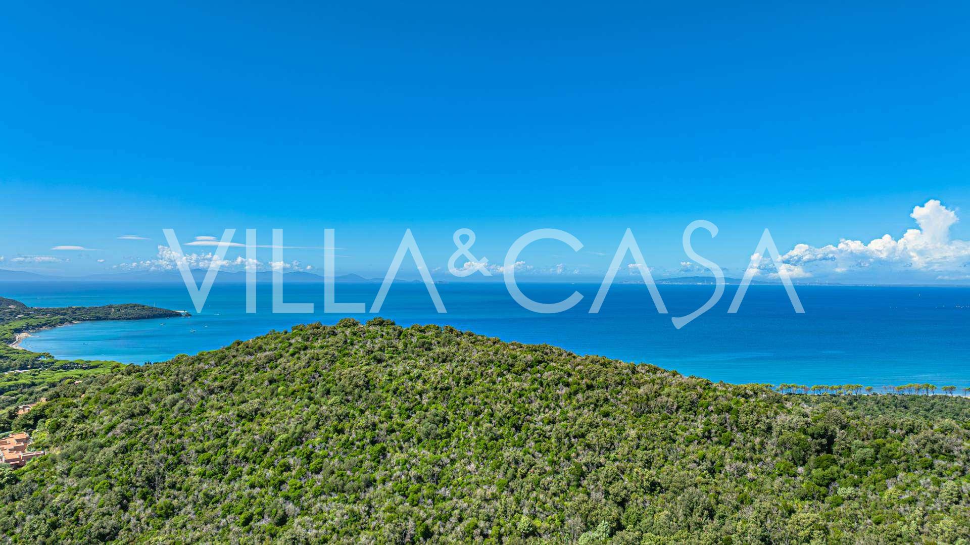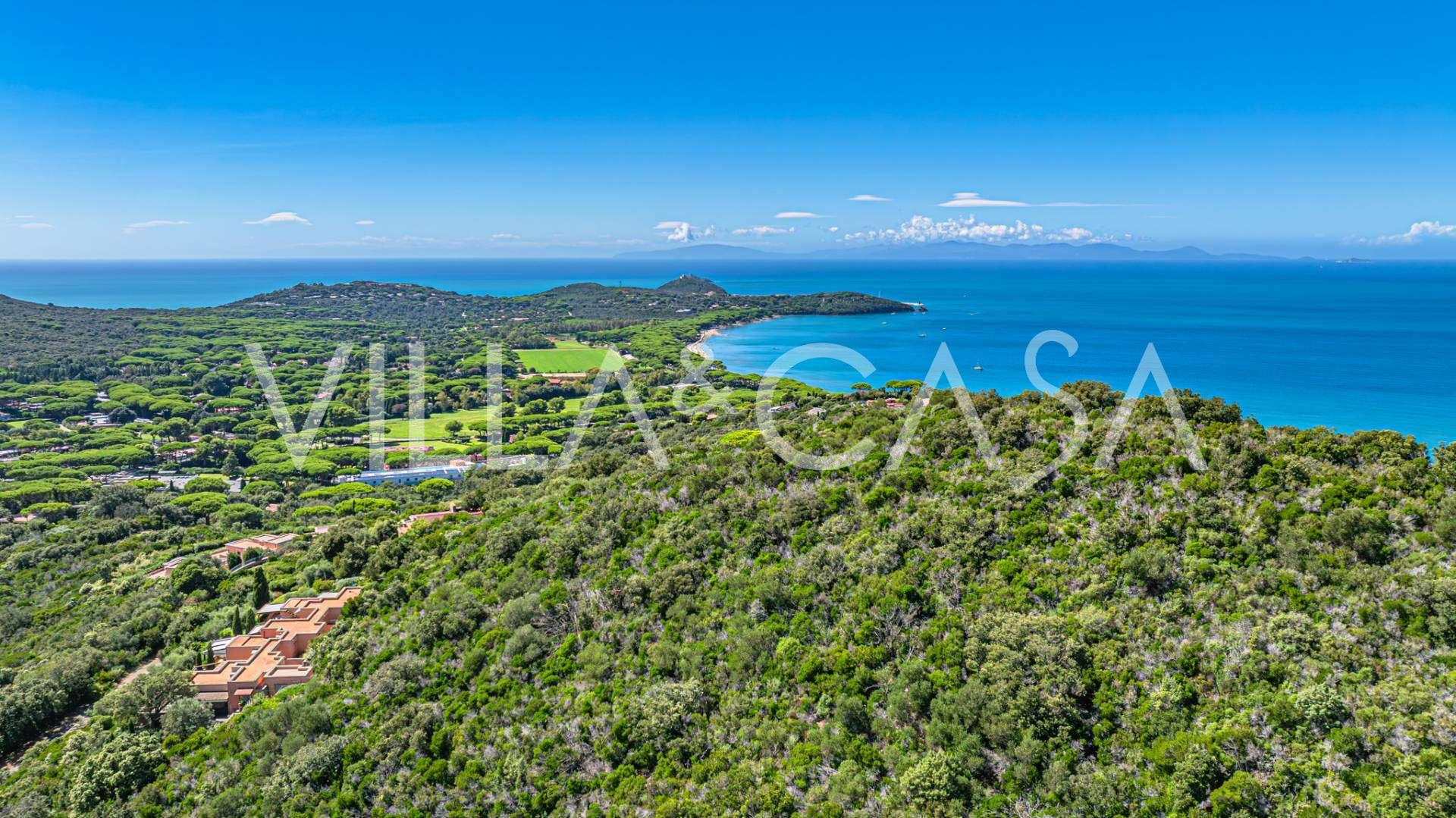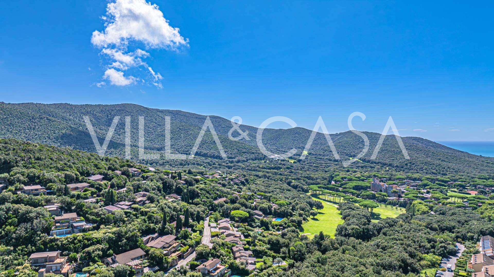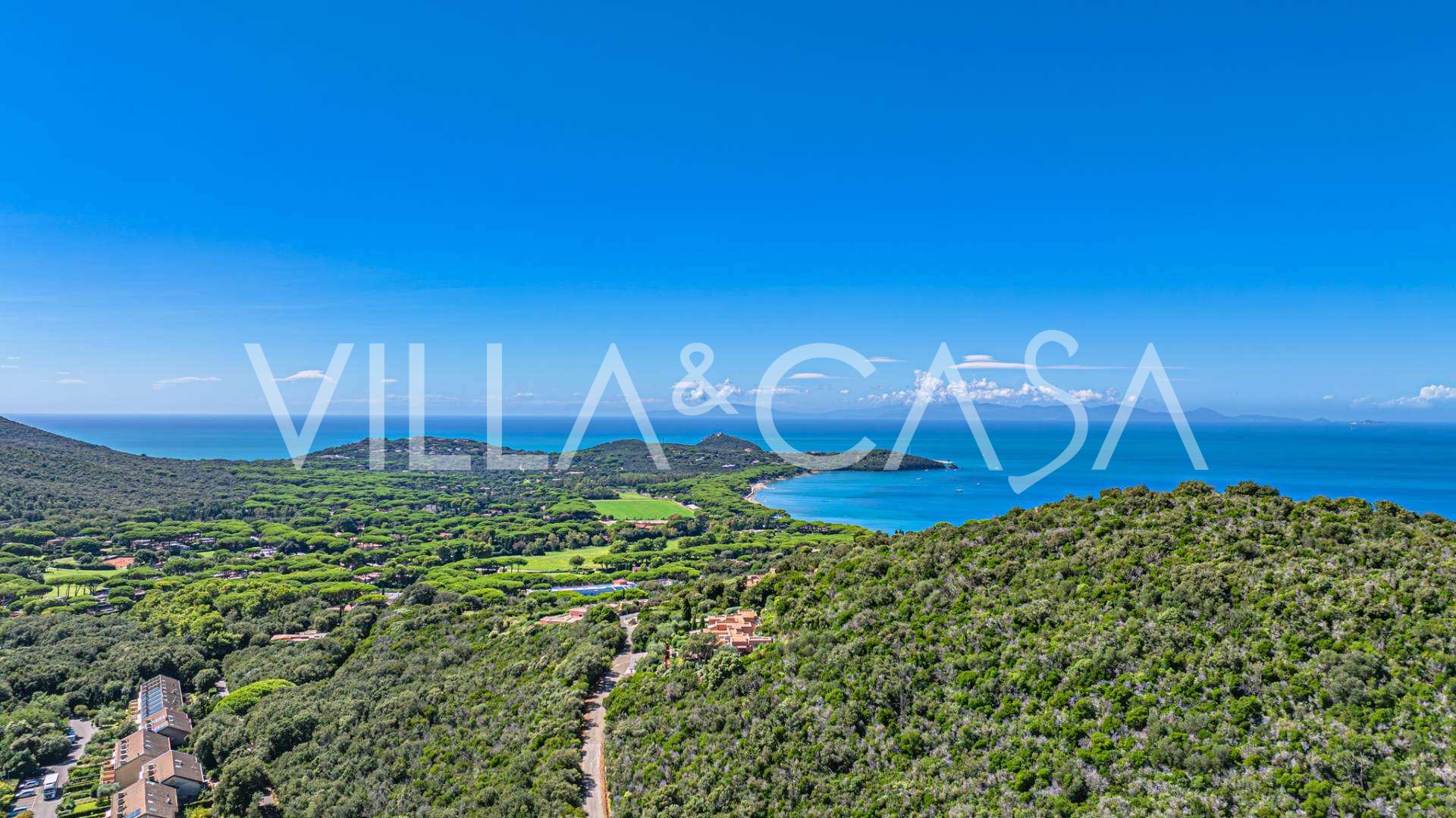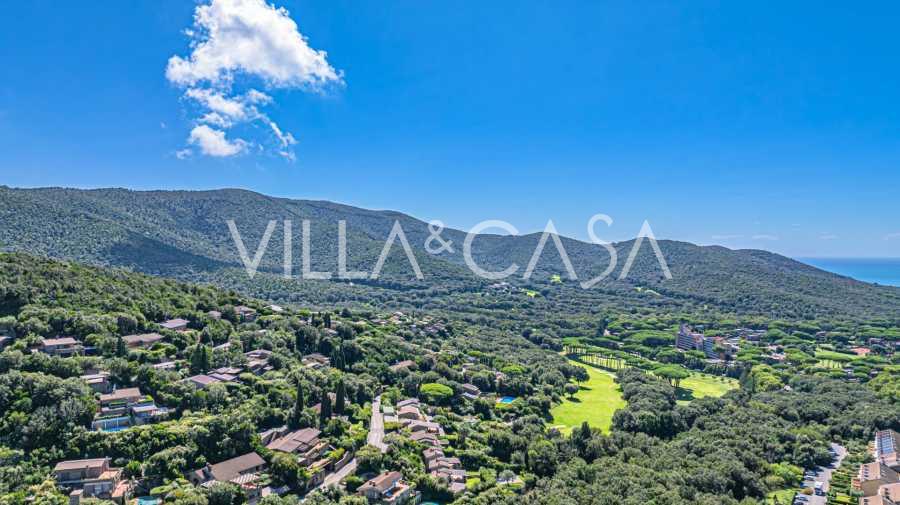 Sulle prime colline di Punta Ala, da cui si apre una vista impressionante sulla costa di Castiglione della Pescaia con le sue sfumature di smeraldo e le morbide linee dei paesaggi toscani, si erge maestosamente questa straordinaria villa di lusso, che riflette lo stile contemporaneo e il massimo comfort.