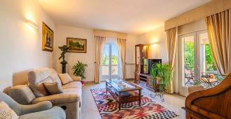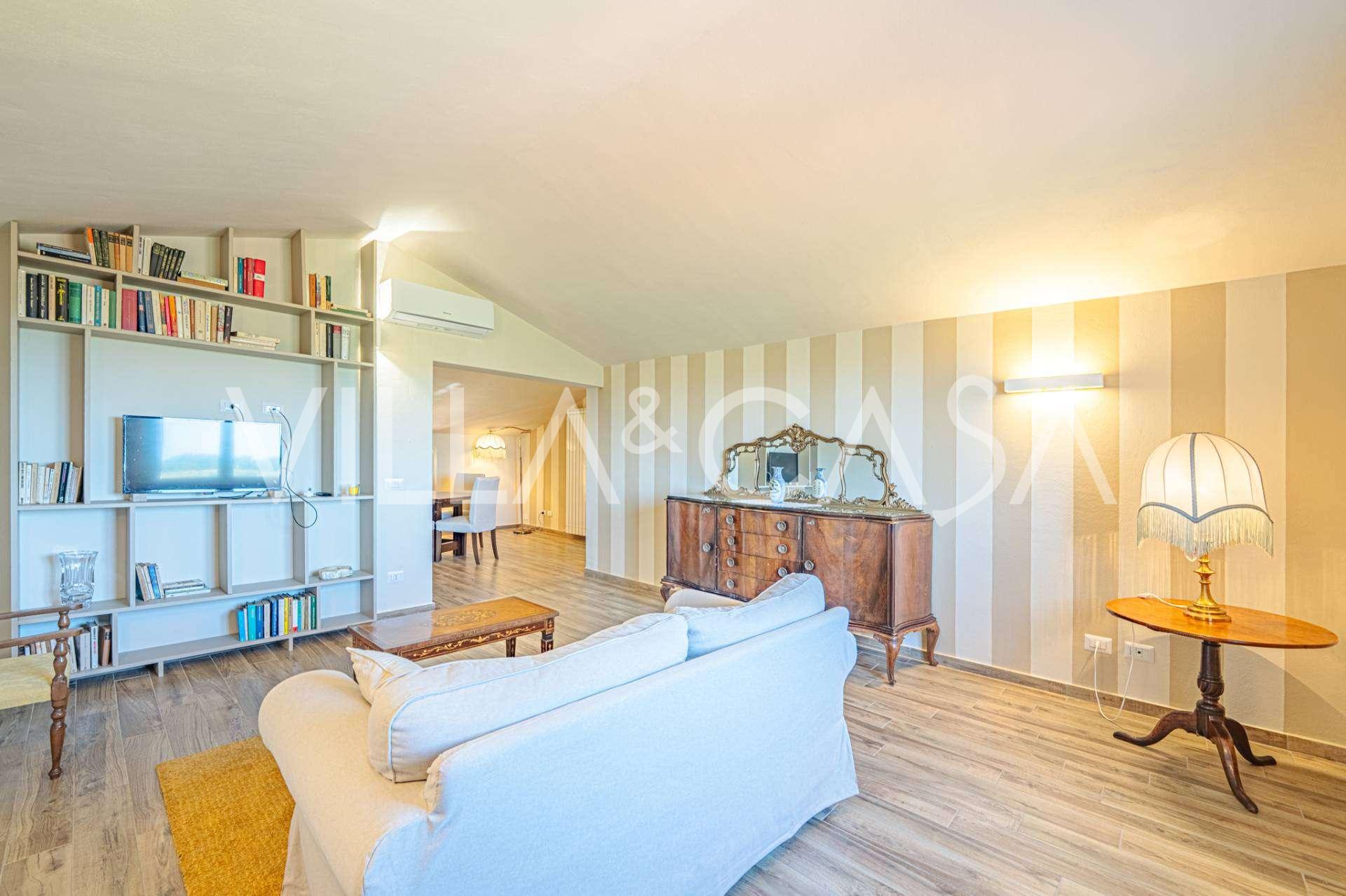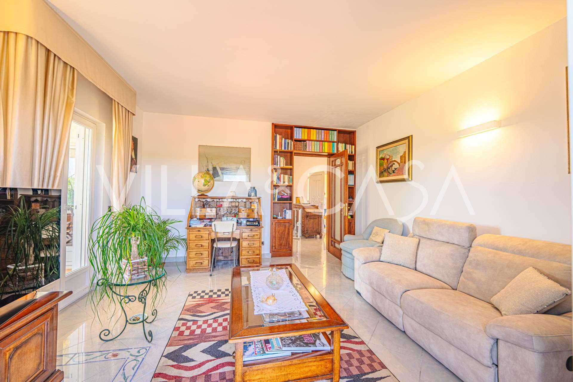 Piano principale: ingresso principale, elegante soggiorno, luminosa sala da pranzo e cucina con accesso alla terrazza con vista mare e al giardino. Qui si trovano anche due eleganti camere da letto e due bagni di stile.