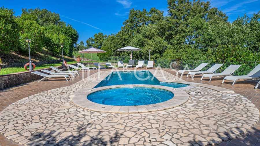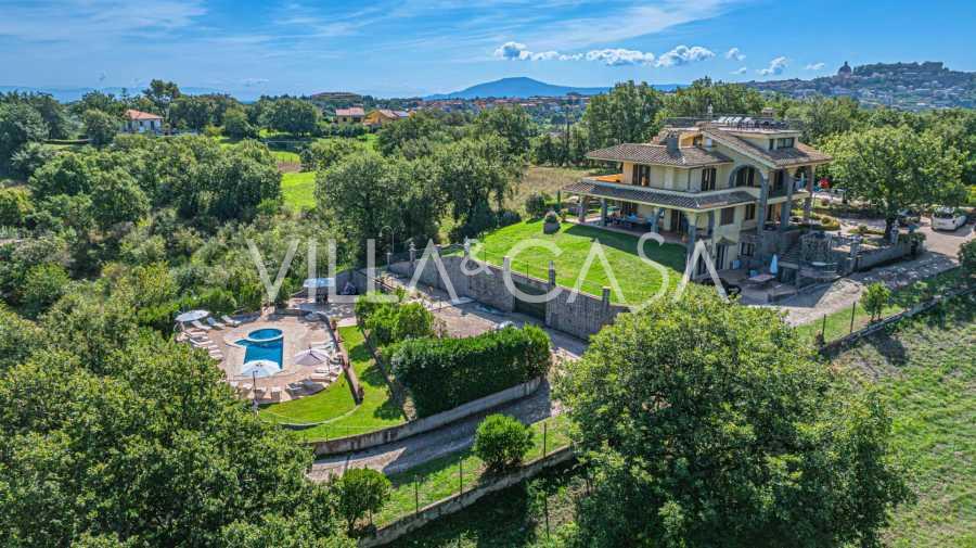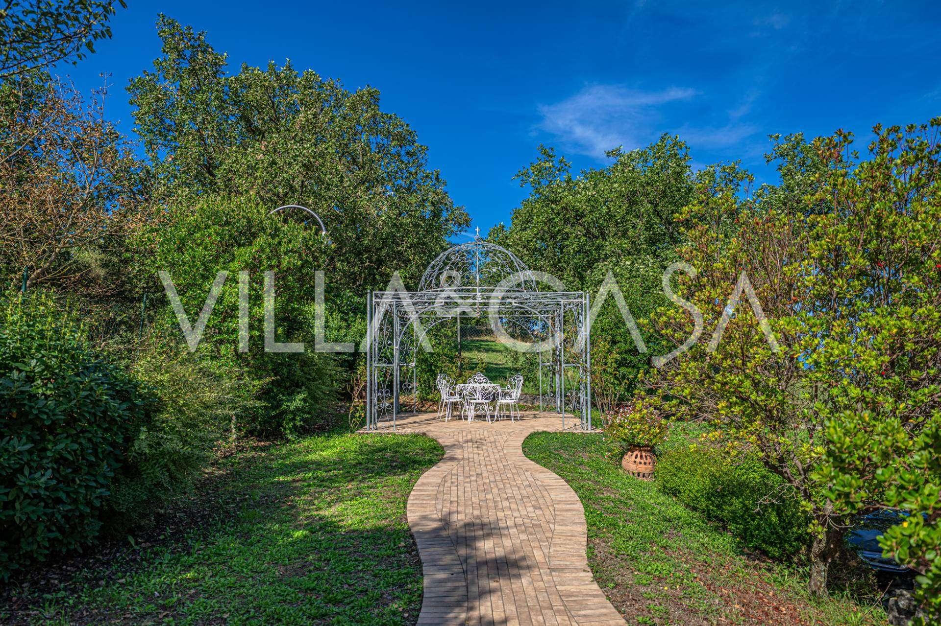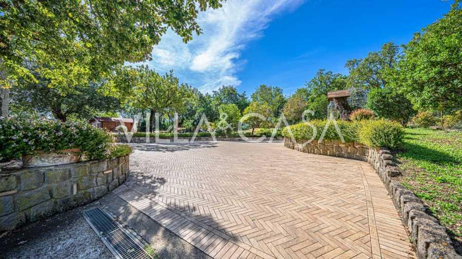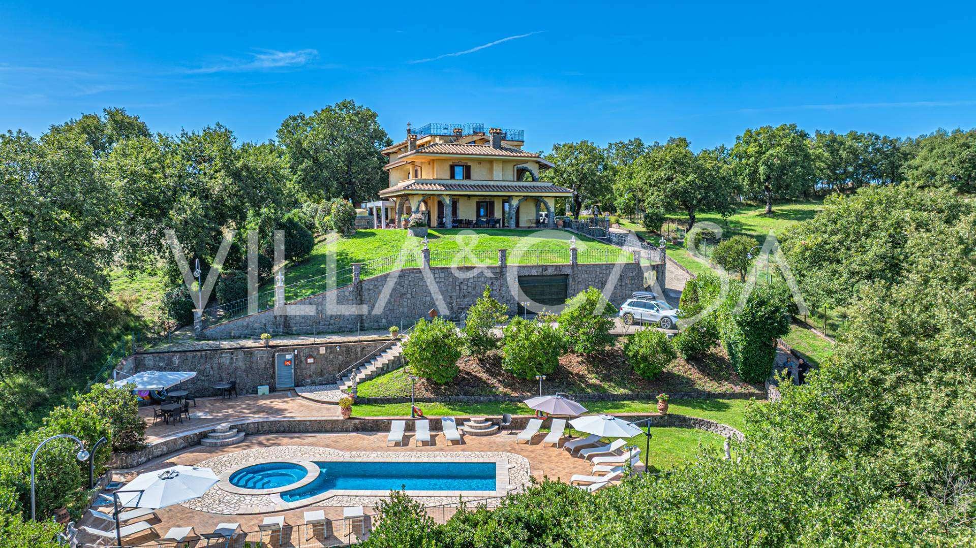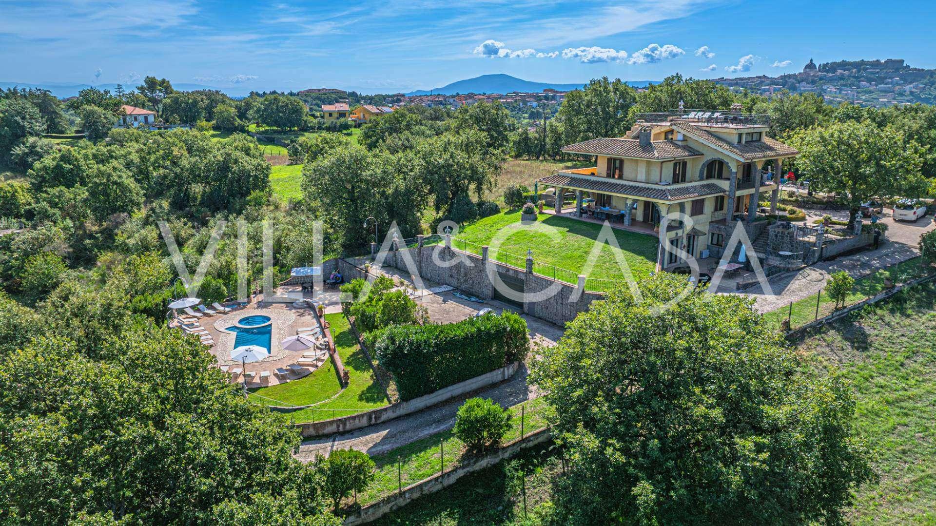 La villa è circondata da un ampio parco di 13.000 m2, dove querce secolari, vegetazione mediterranea e un frutteto creano un'atmosfera di totale privacy. La proprietà è completamente recintata e dotata di una propria fonte d'acqua. Dalla terrazza soleggiata si può ammirare il Mar Tirreno, raggiungibile in mezz'ora di macchina, mentre la pittoresca Montefiascone con il famoso vino Est! Est!! Est!!! è a pochi passi.