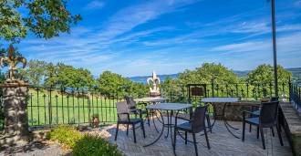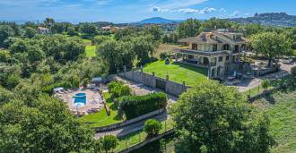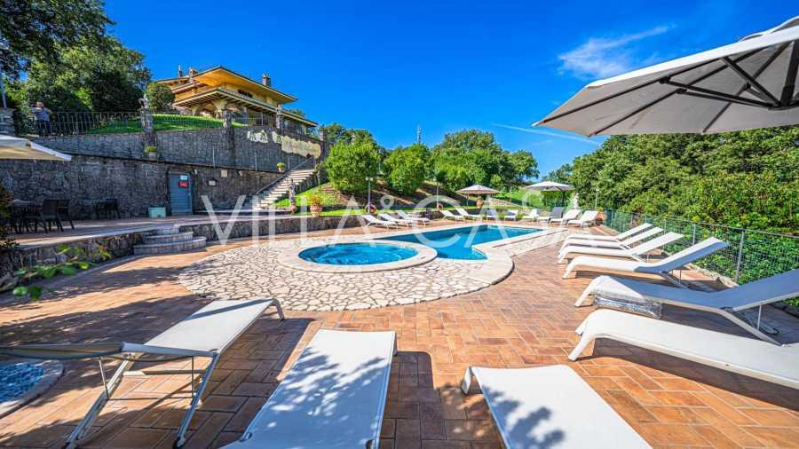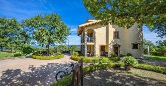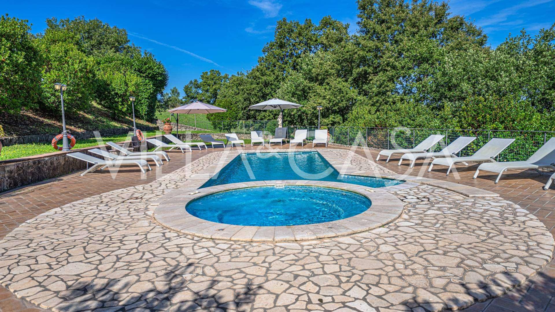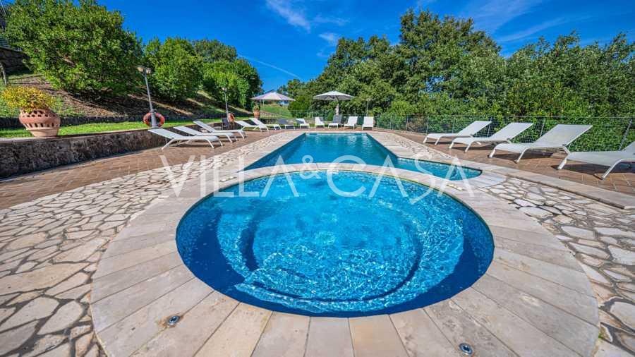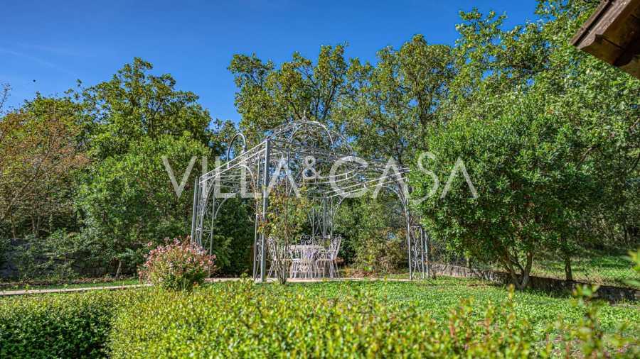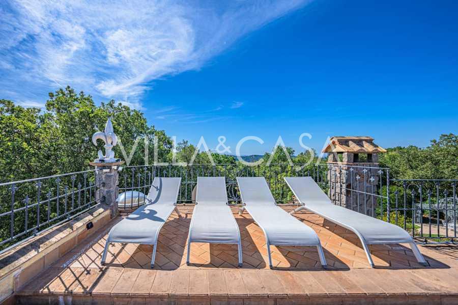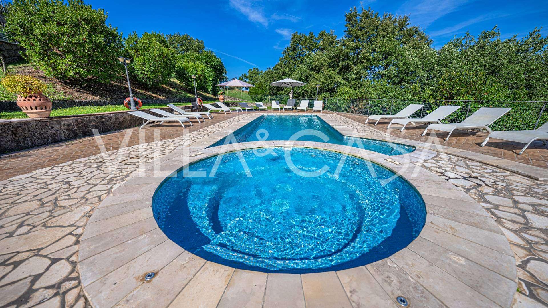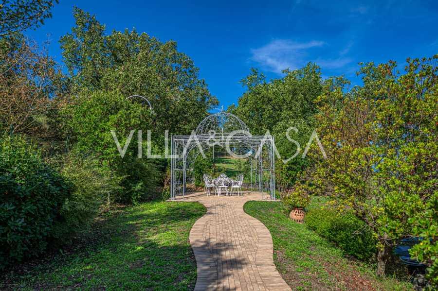 La villa è circondata da un ampio parco di 13.000 m2, dove querce secolari, vegetazione mediterranea e un frutteto creano un'atmosfera di totale privacy. La proprietà è completamente recintata e dotata di una propria fonte d'acqua. Dalla terrazza soleggiata si può ammirare il Mar Tirreno, raggiungibile in mezz'ora di macchina, mentre la pittoresca Montefiascone con il famoso vino Est! Est!! Est!!! è a pochi passi.