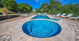 Al livello inferiore del giardino si trova un'elegante area relax con piscina e idromassaggio, circondata dal verde e arricchita da un'illuminazione serale che crea l'atmosfera di un lussuoso resort. Qui si può godere di pace e tranquillità, non disturbate da rumori o frenesia.