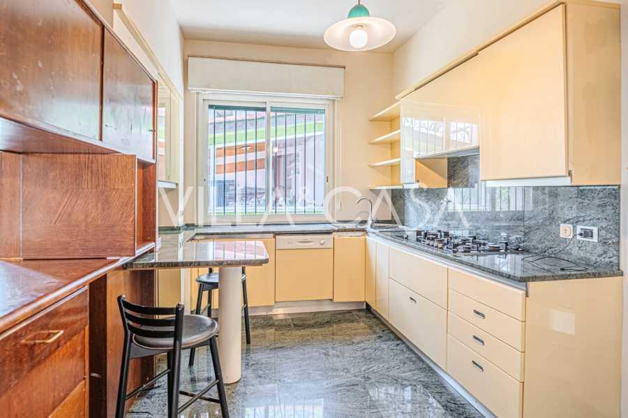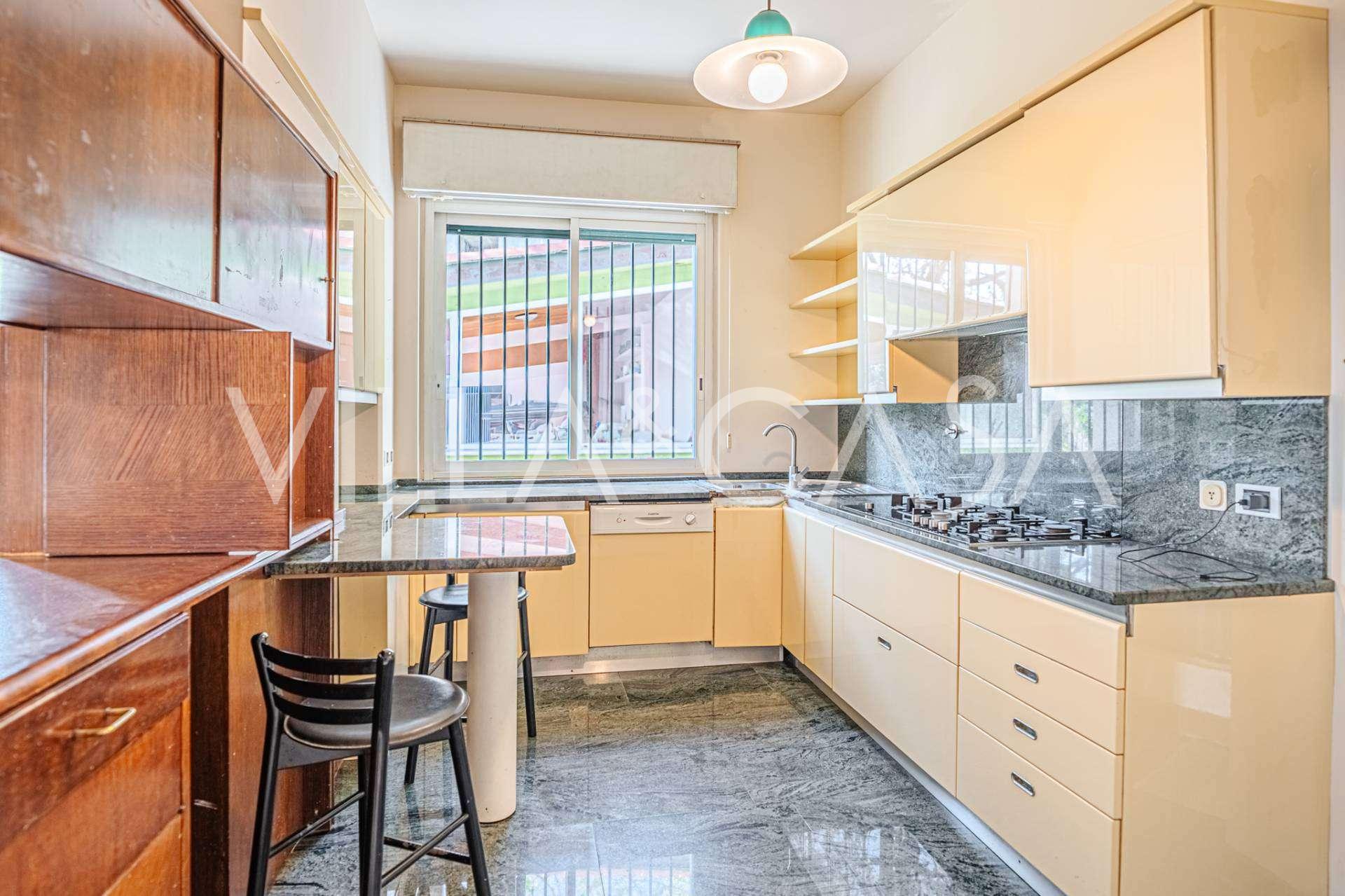 Ampio soggiorno con vista mare, cucina separata, dispensa, cantina, tre locali di servizio e garage per due auto.