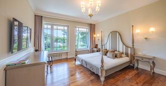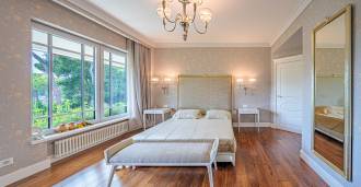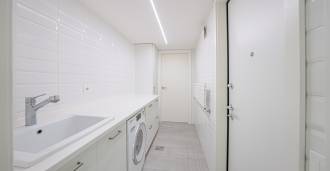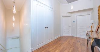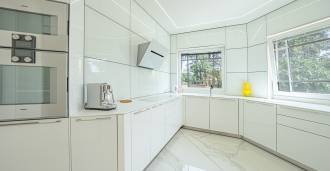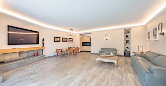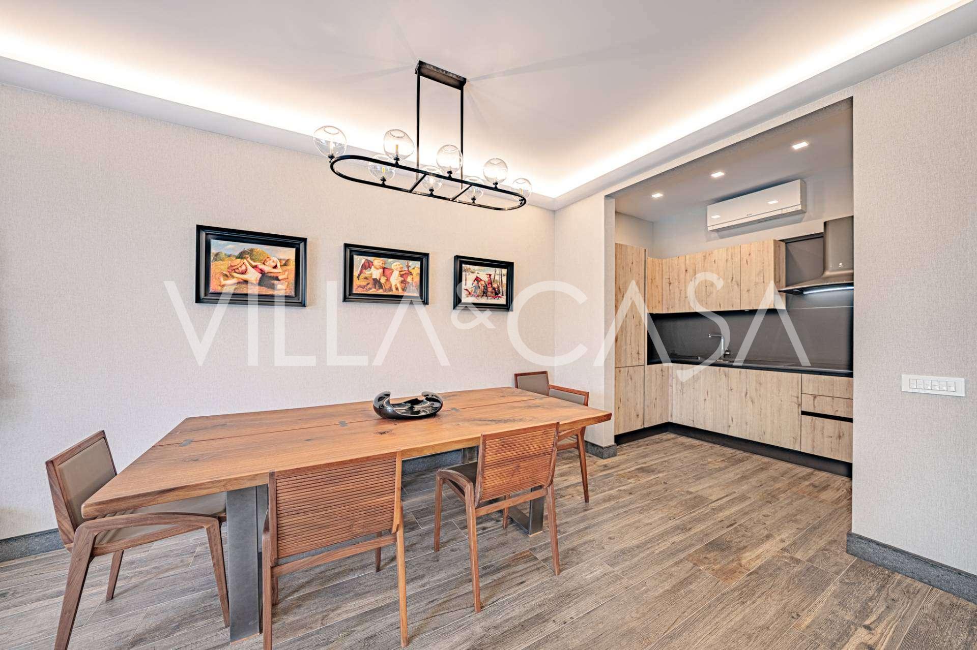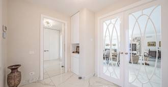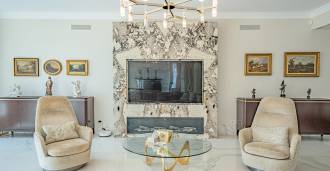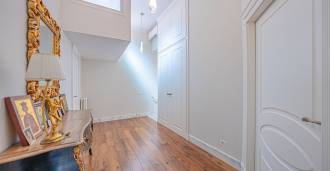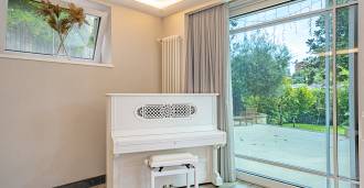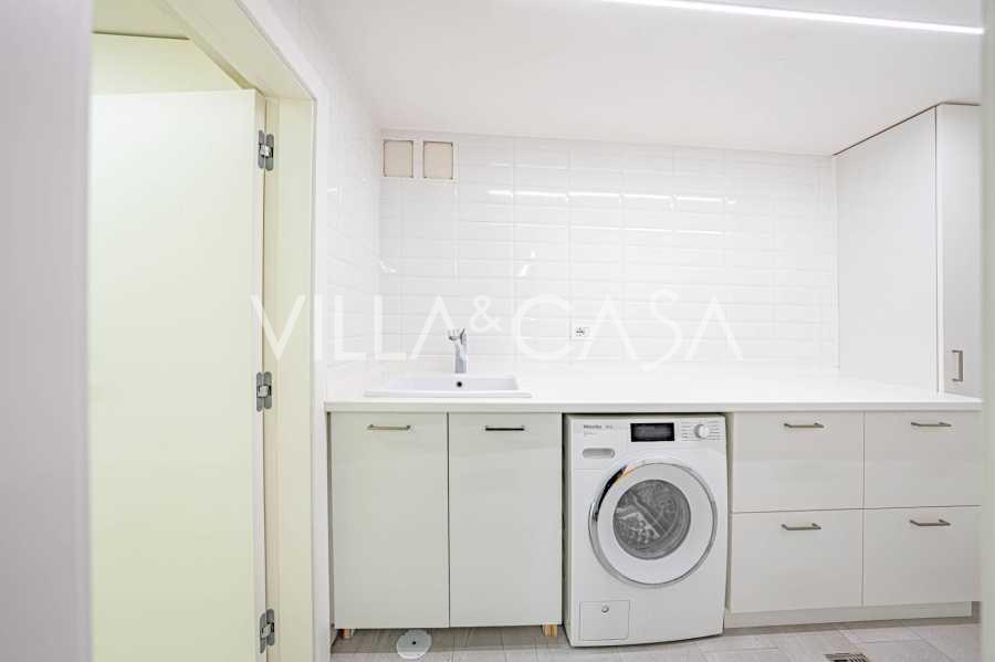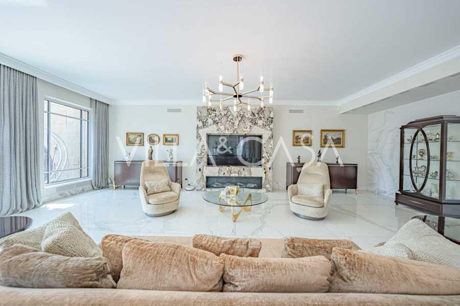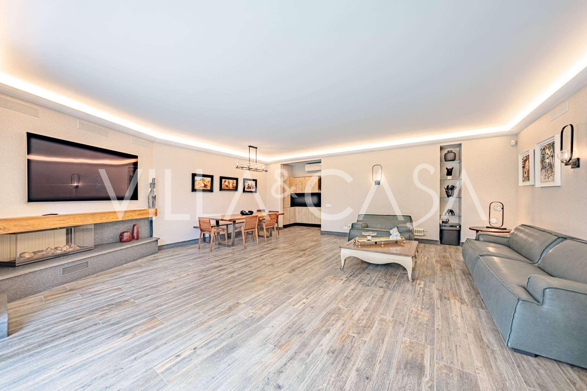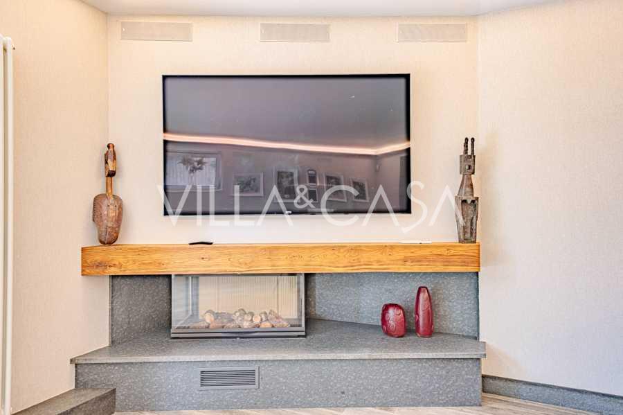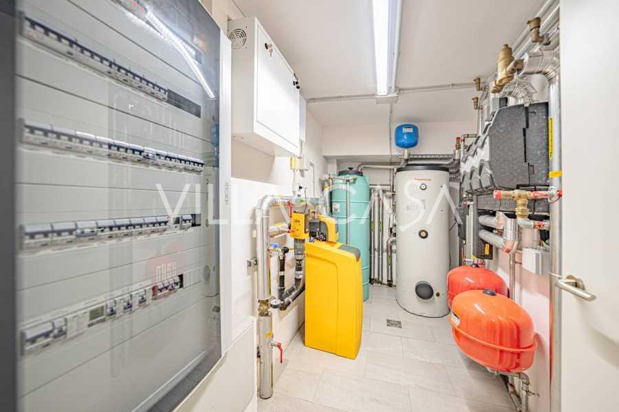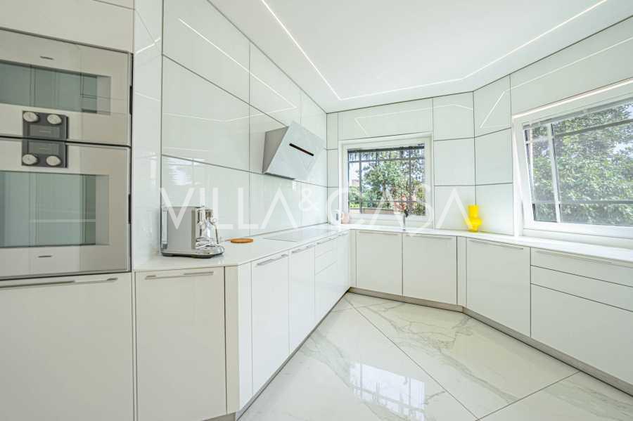 Piano terra: elegante atrio, ampio soggiorno con biocamino di design e finestre panoramiche che conducono alla terrazza; cucina ultramoderna con elettrodomestici dei migliori marchi; zona di servizio separata (lavanderia, locale tecnico, garage riscaldato con accesso diretto alla casa); ufficio privato con cucina e bagno propri.