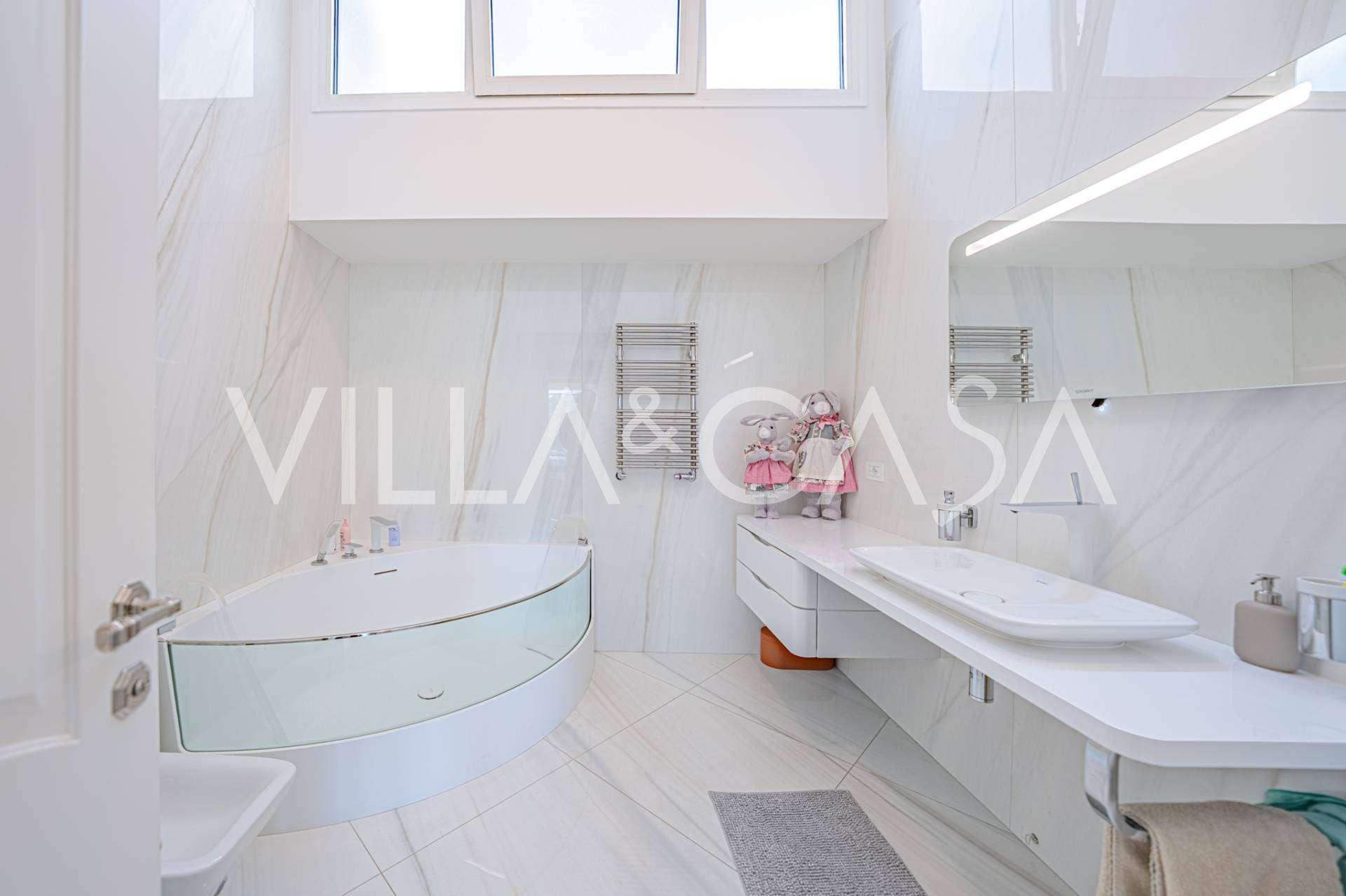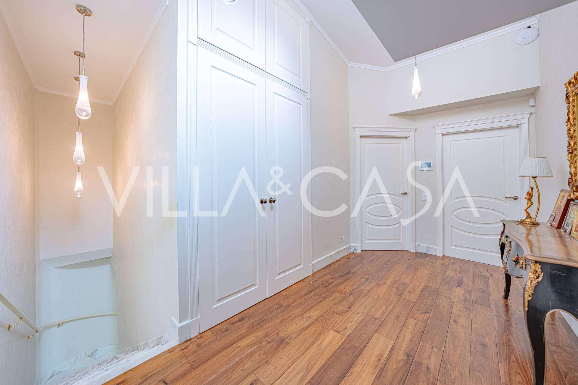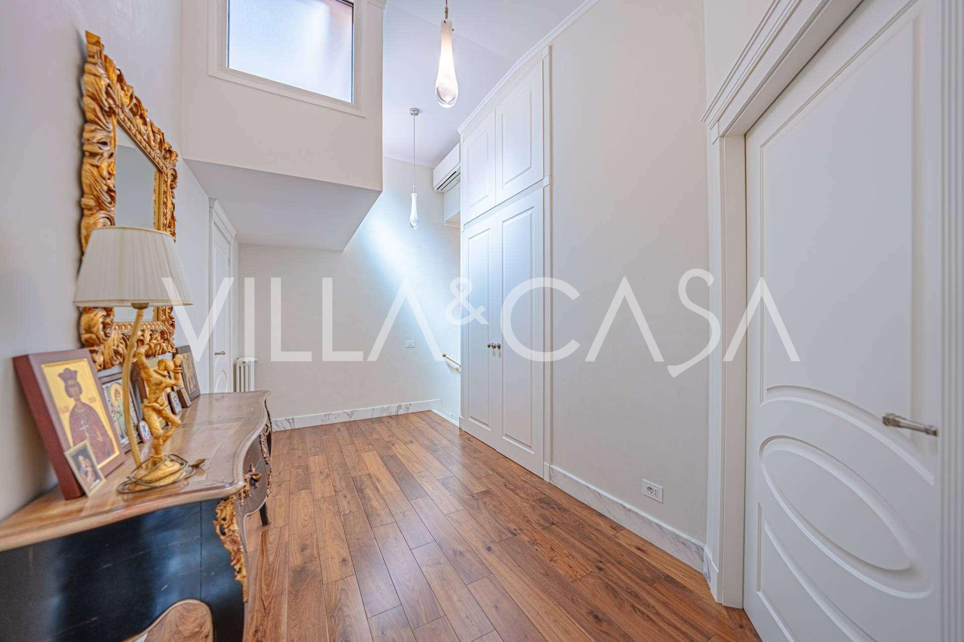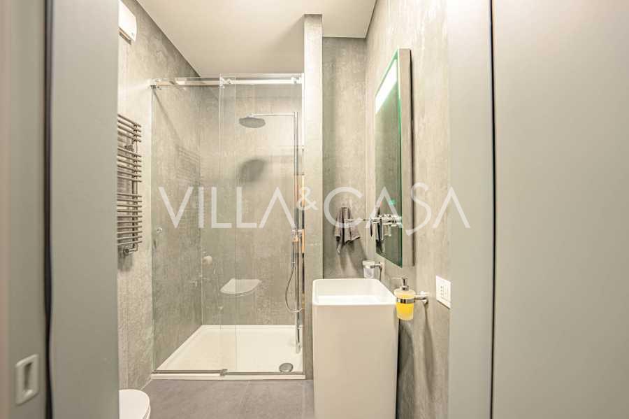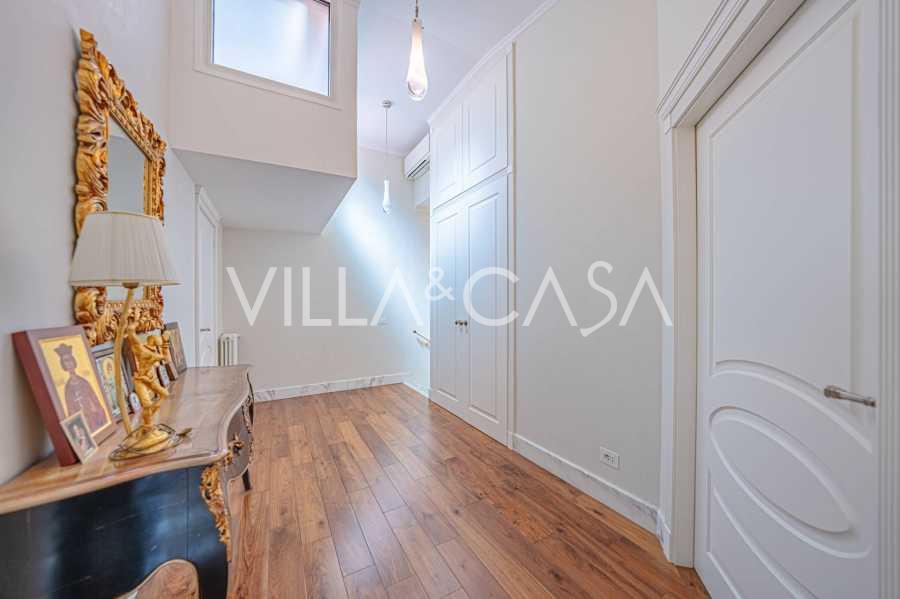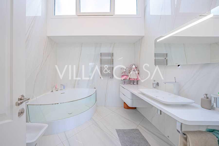 Gli interni di altissimo livello includono solo i migliori materiali: gres porcellanato di classe premium nei soggiorni e nei bagni, parquet a doghe larghe nella zona relax, scala in marmo, finestre Schüco con vetro antieffrazione. Gli arredi integrati, realizzati su misura, sono un capolavoro dell'arte della falegnameria italiana. I moderni sistemi ingegneristici assicurano un'alta efficienza energetica di classe A.