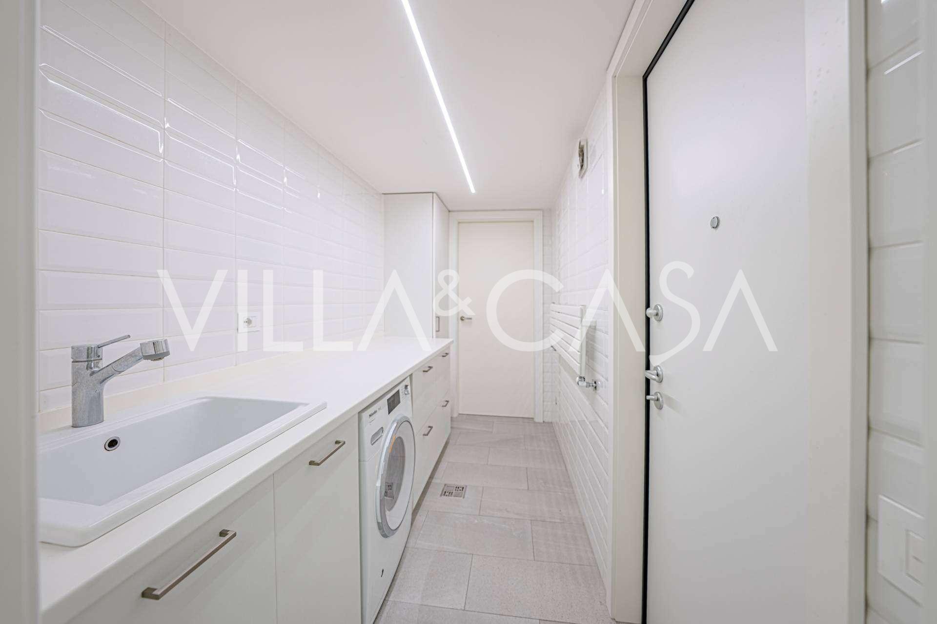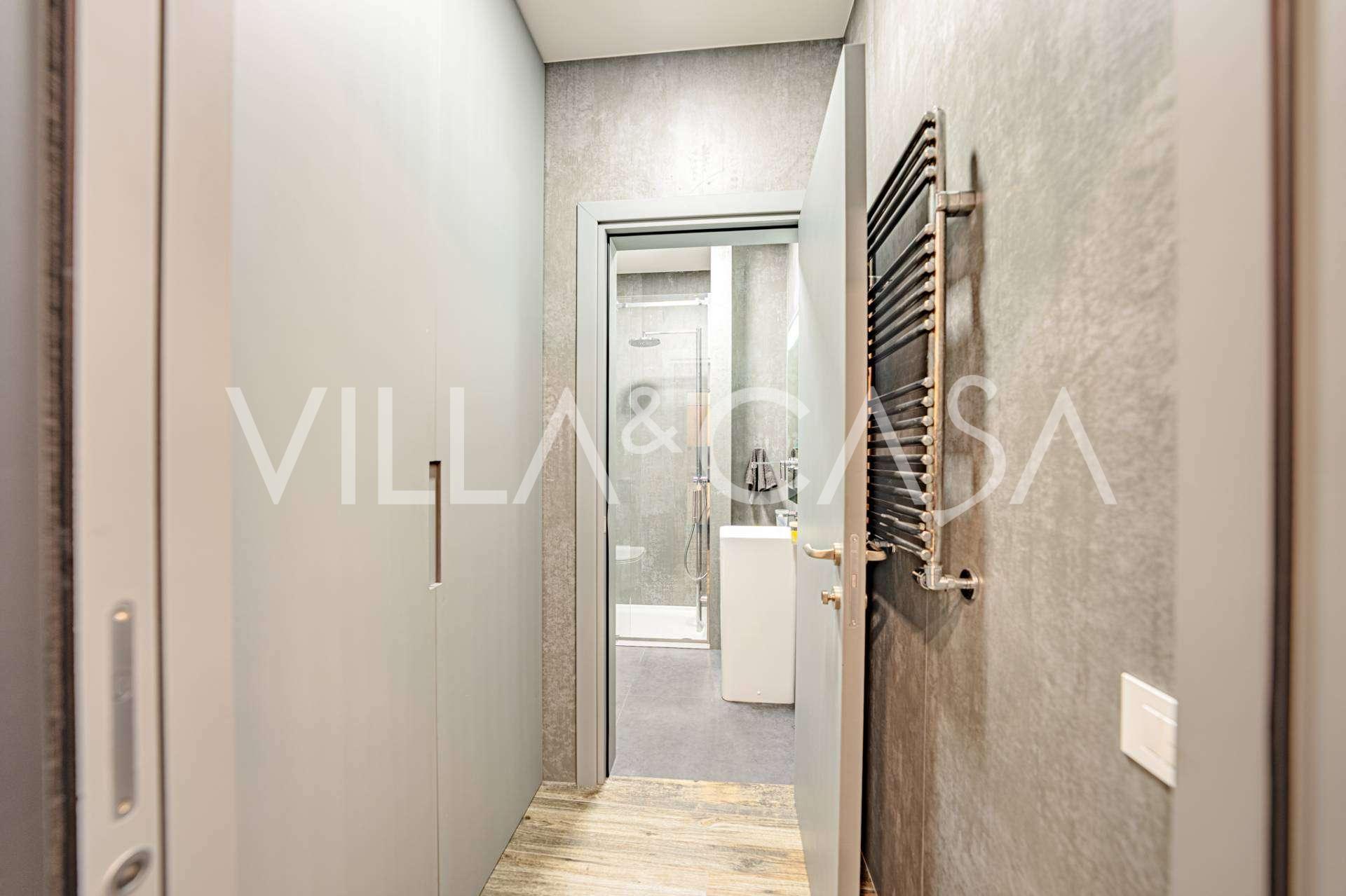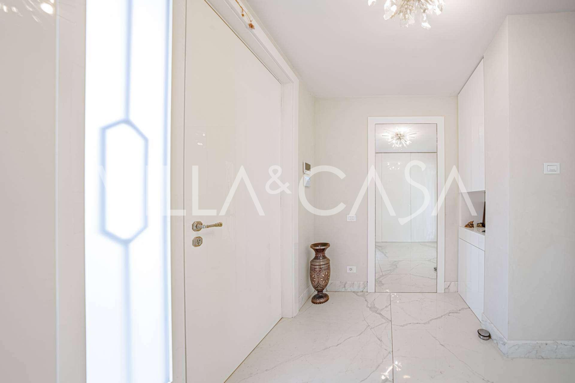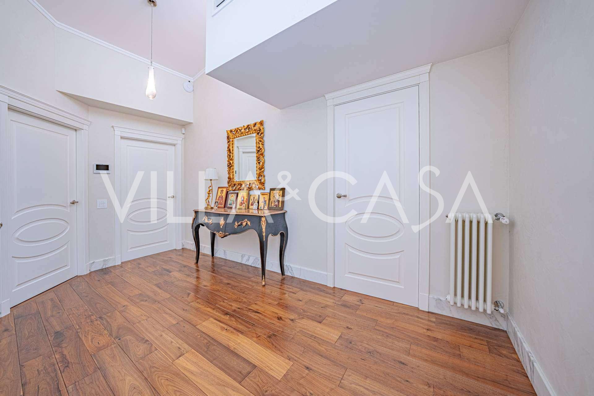 Gli interni di altissimo livello includono solo i migliori materiali: gres porcellanato di classe premium nei soggiorni e nei bagni, parquet a doghe larghe nella zona relax, scala in marmo, finestre Schüco con vetro antieffrazione. Gli arredi integrati, realizzati su misura, sono un capolavoro dell'arte della falegnameria italiana. I moderni sistemi ingegneristici assicurano un'alta efficienza energetica di classe A.