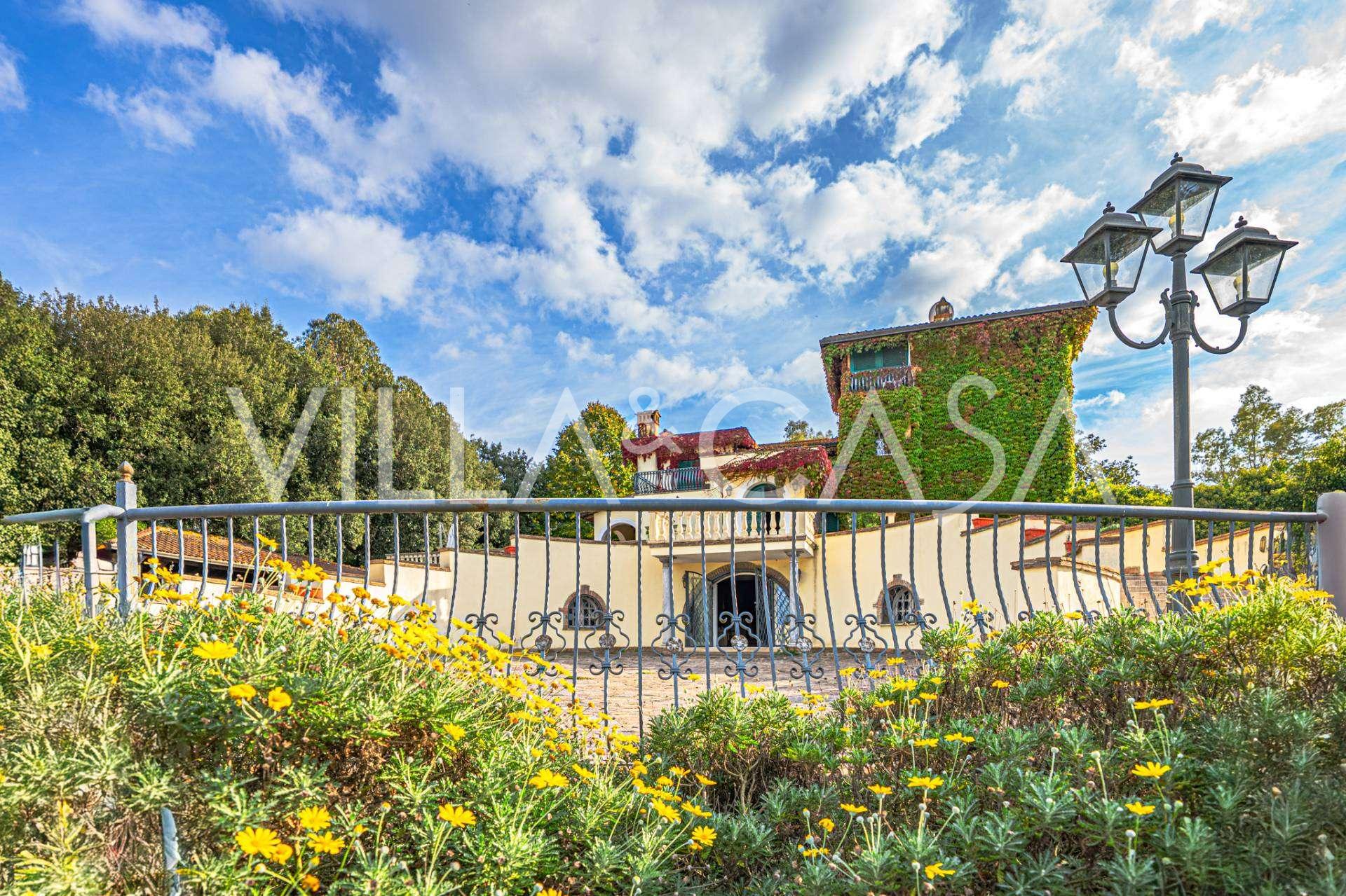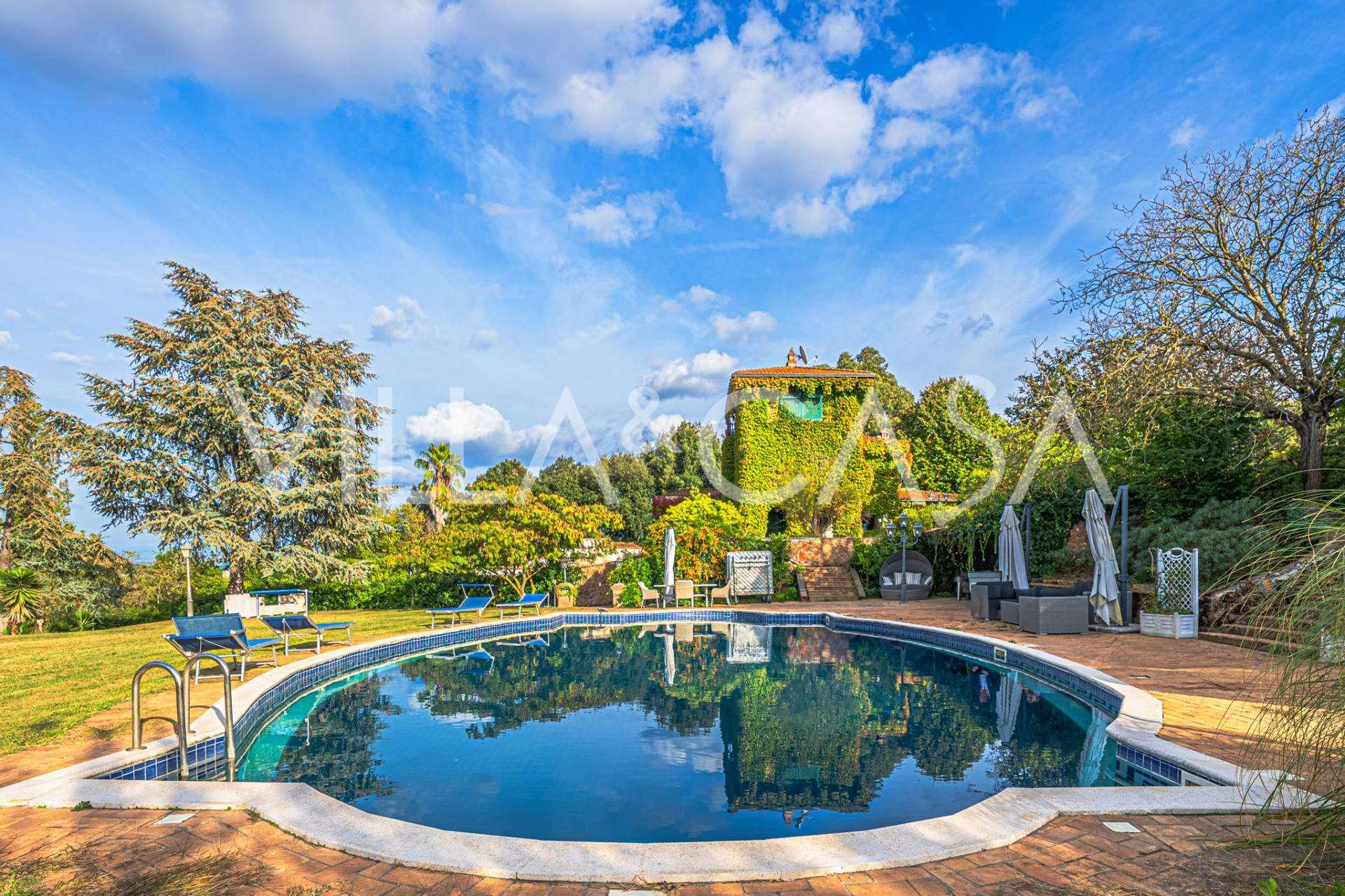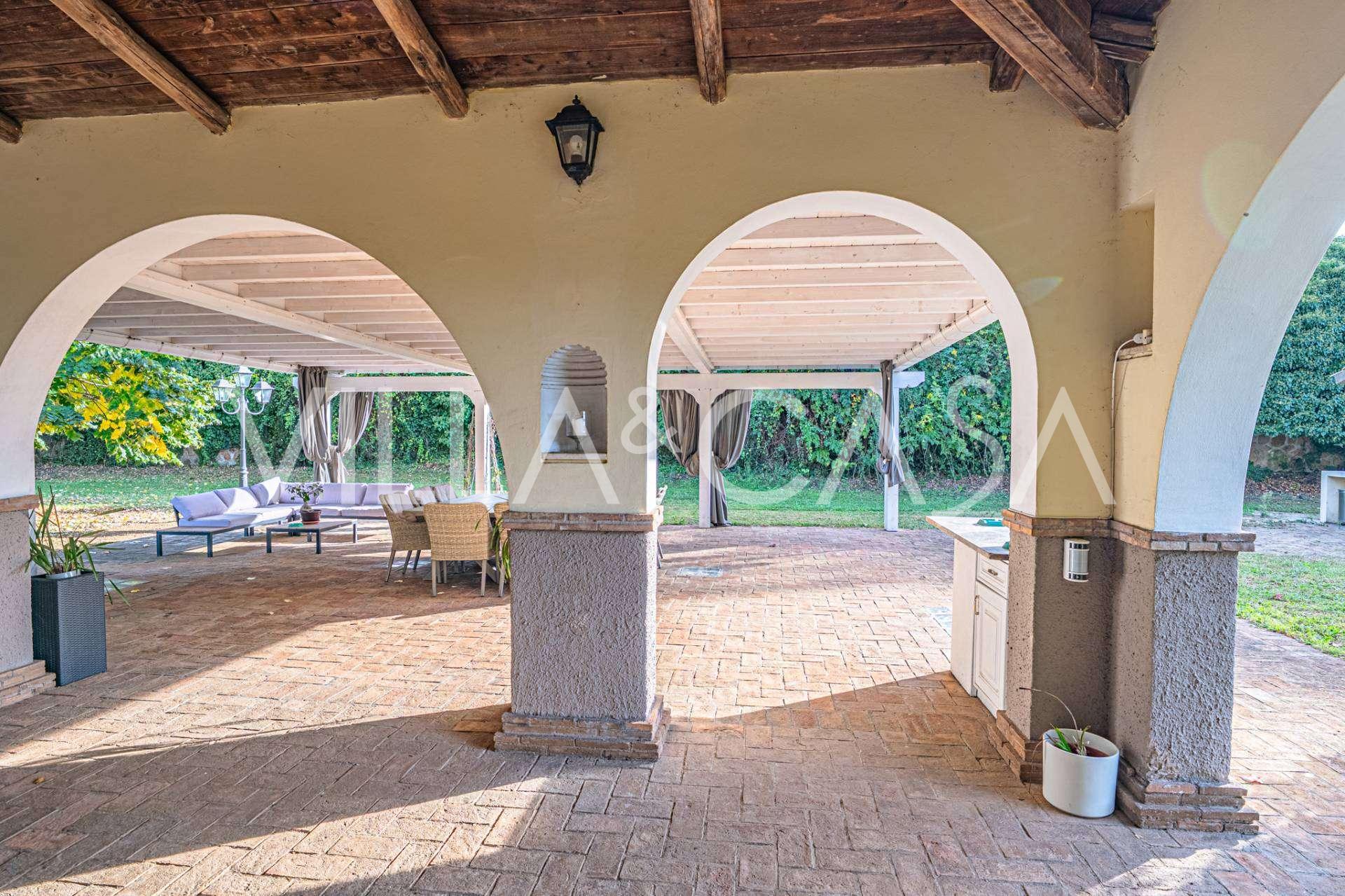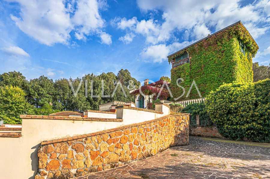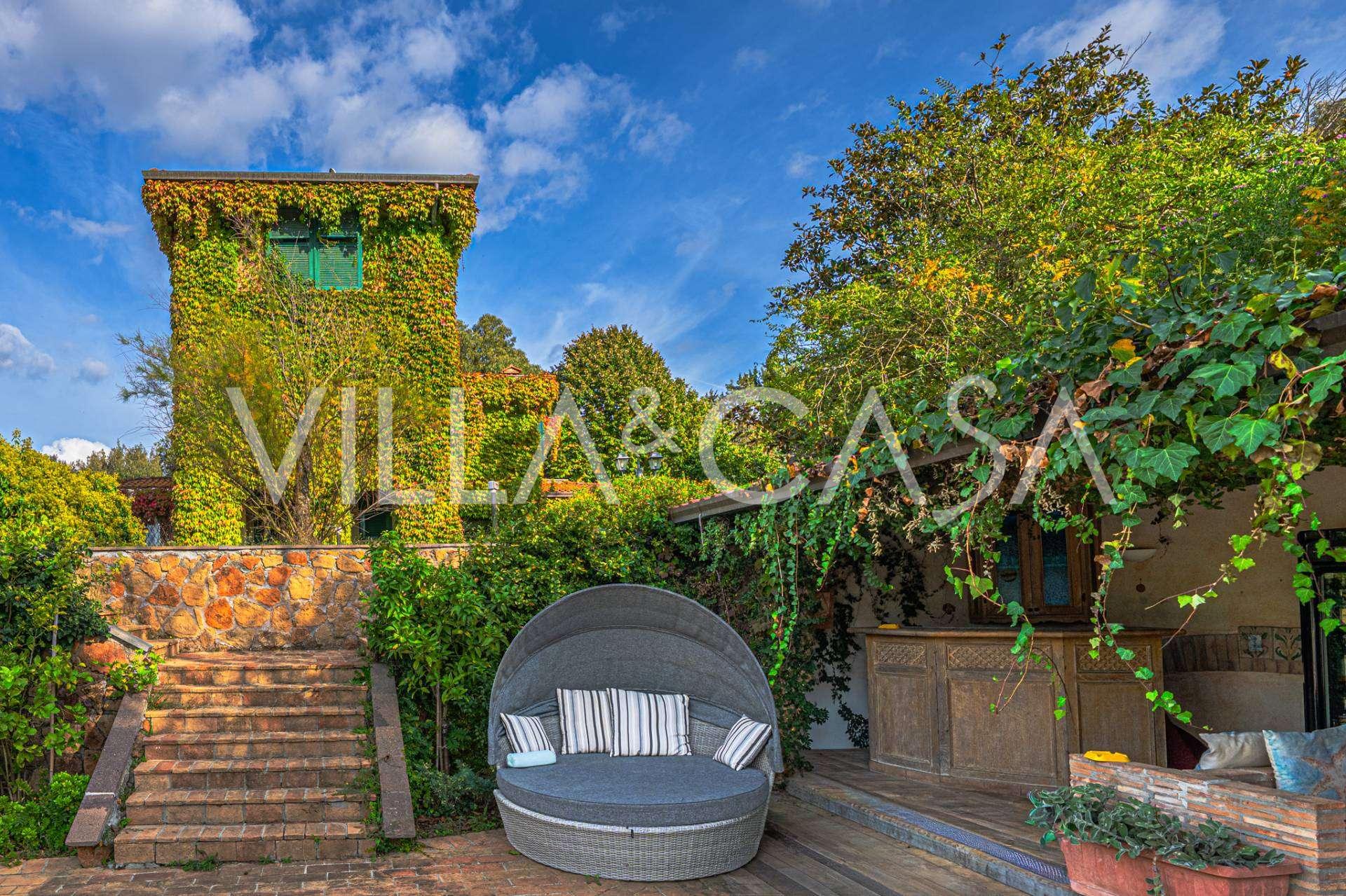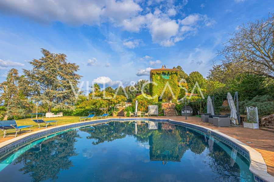 Lo spazio esterno della villa è un'opera d'arte a cielo aperto. Due terrazze panoramiche offrono viste incantevoli sui paesaggi di Agro Romano. Al centro del giardino si trova una piscina di design con mosaico azzurro, circondata da fiori profumati e verde, un luogo dove il lusso incontra la natura. Una romantica scala di pietra conduce ad essa, scendendo da un'antica torre ricoperta di edera verde. Un elegante gazebo con zona per cene all'aperto, un bar a bordo piscina e un'area barbecue trasformano la villa nel luogo ideale per ricevimenti, feste e relax privato.
