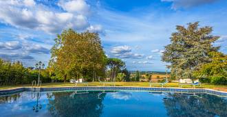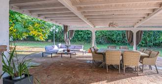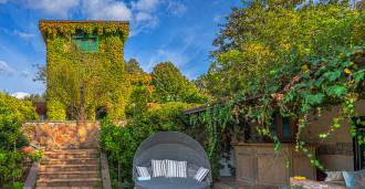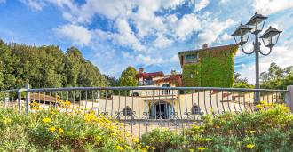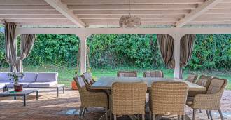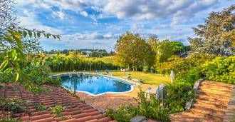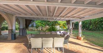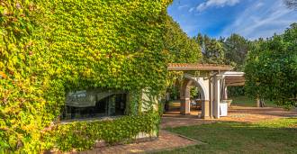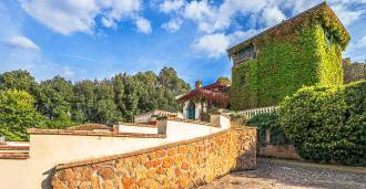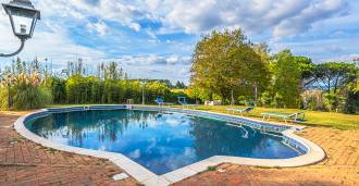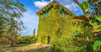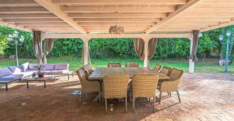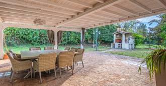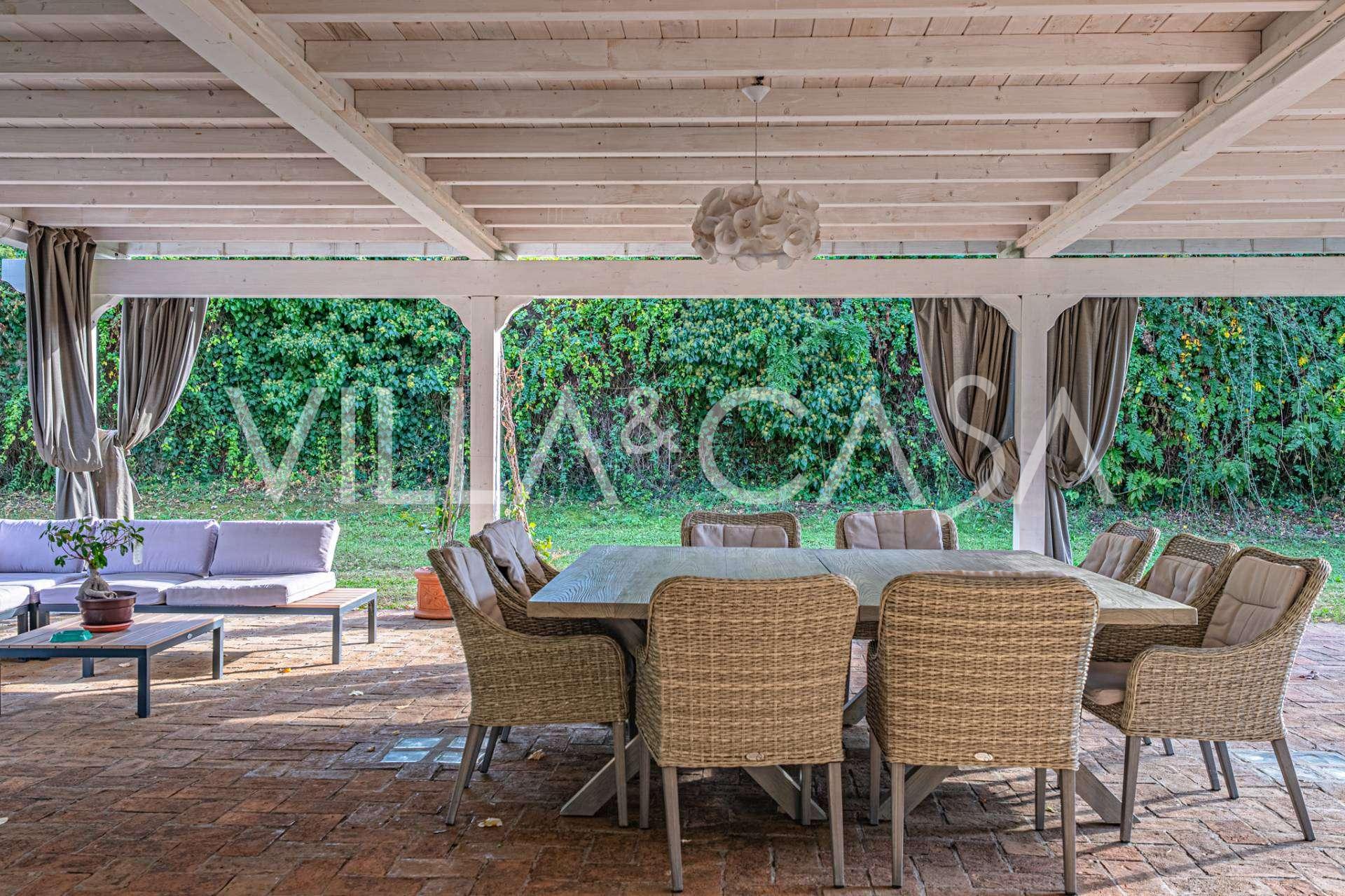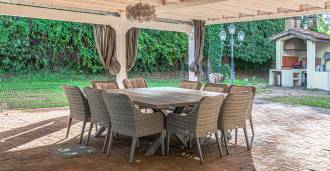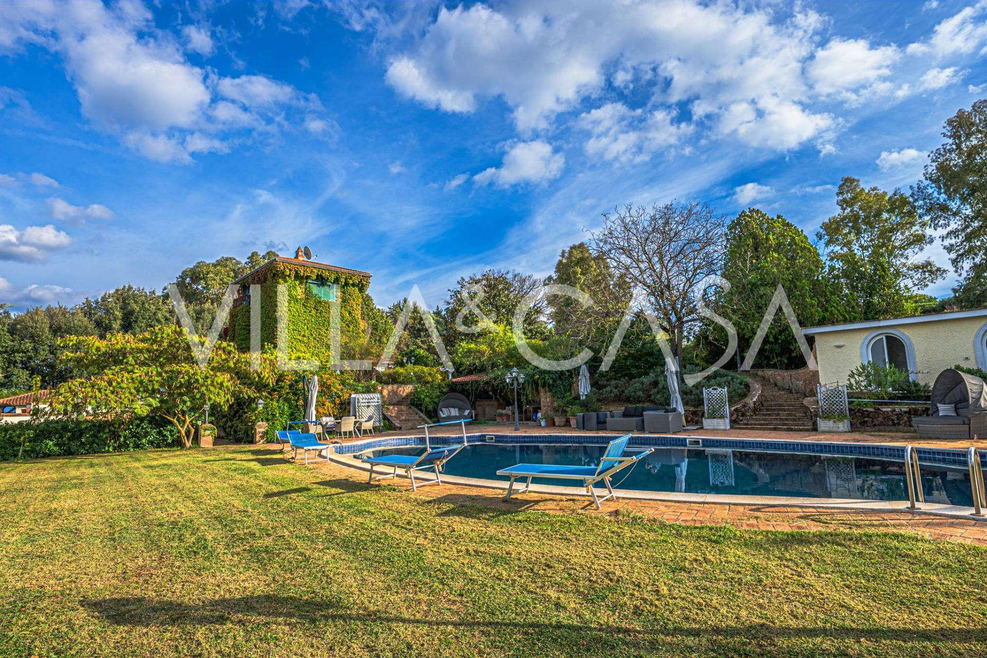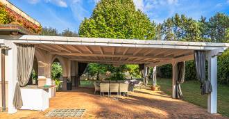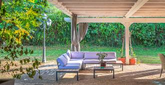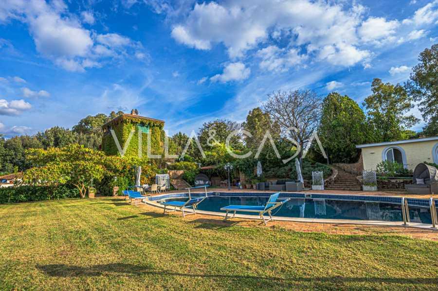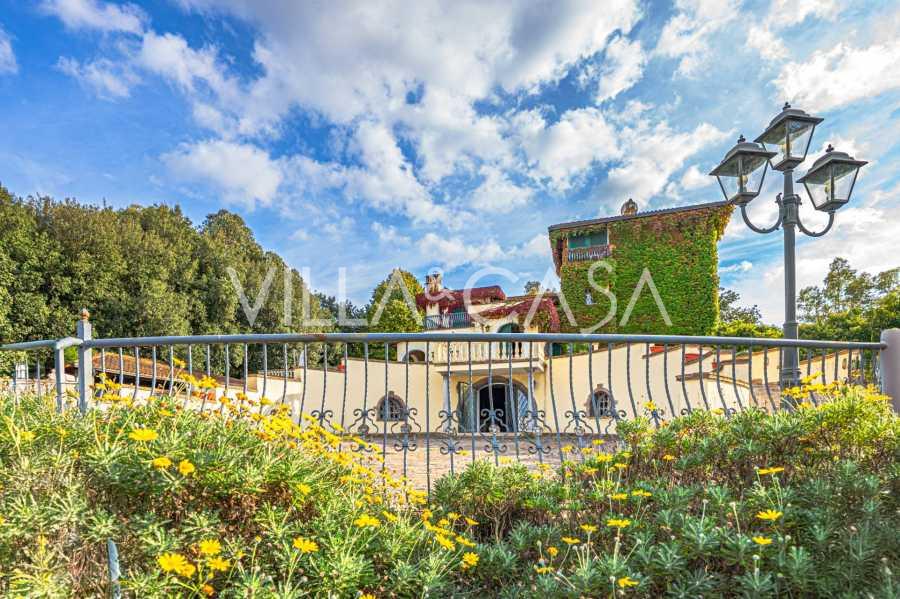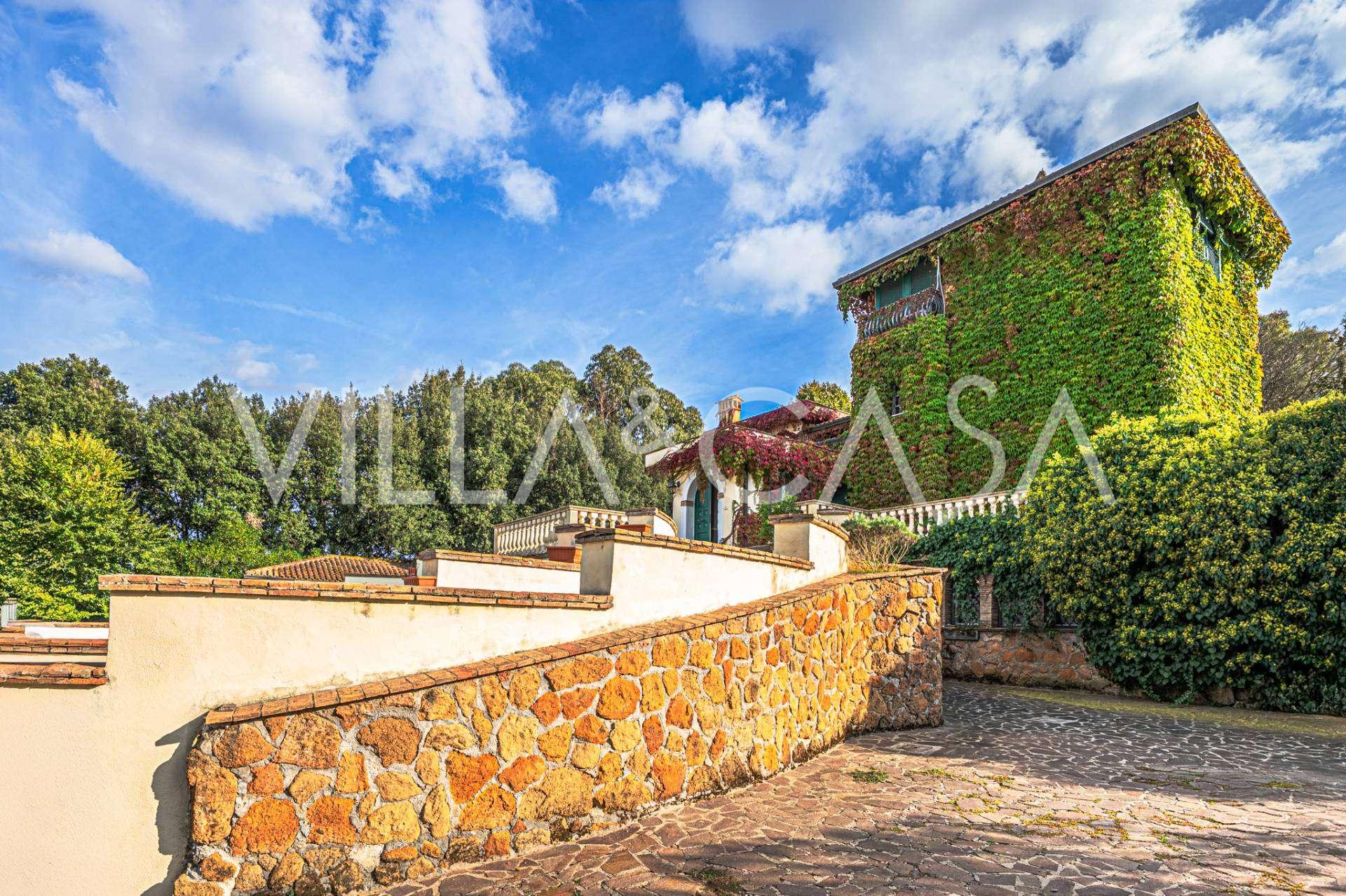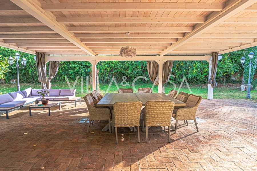 Lo spazio esterno della villa è un'opera d'arte a cielo aperto. Due terrazze panoramiche offrono viste incantevoli sui paesaggi di Agro Romano. Al centro del giardino si trova una piscina di design con mosaico azzurro, circondata da fiori profumati e verde, un luogo dove il lusso incontra la natura. Una romantica scala di pietra conduce ad essa, scendendo da un'antica torre ricoperta di edera verde. Un elegante gazebo con zona per cene all'aperto, un bar a bordo piscina e un'area barbecue trasformano la villa nel luogo ideale per ricevimenti, feste e relax privato.