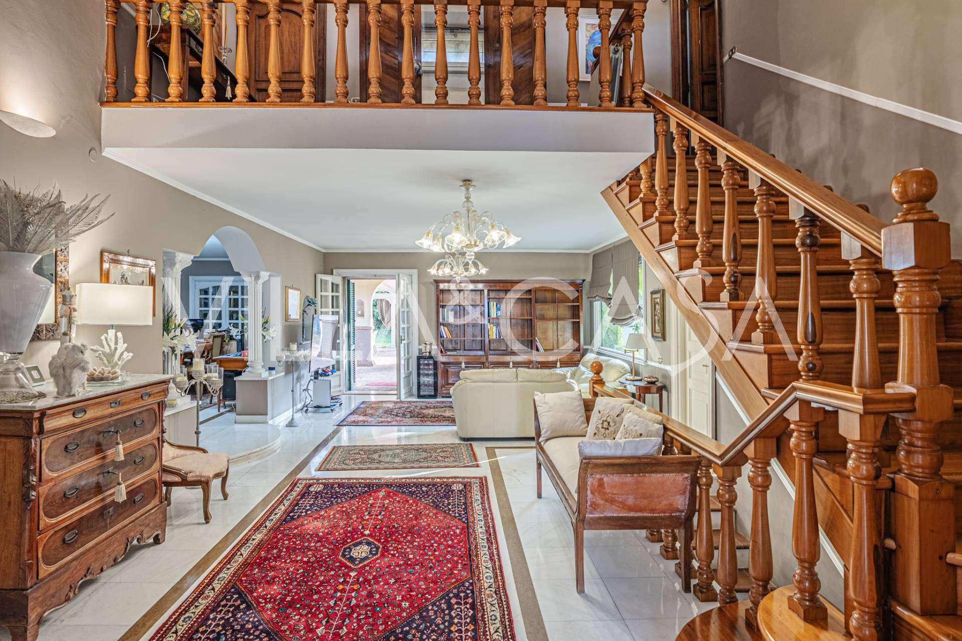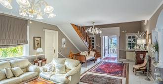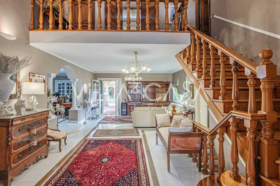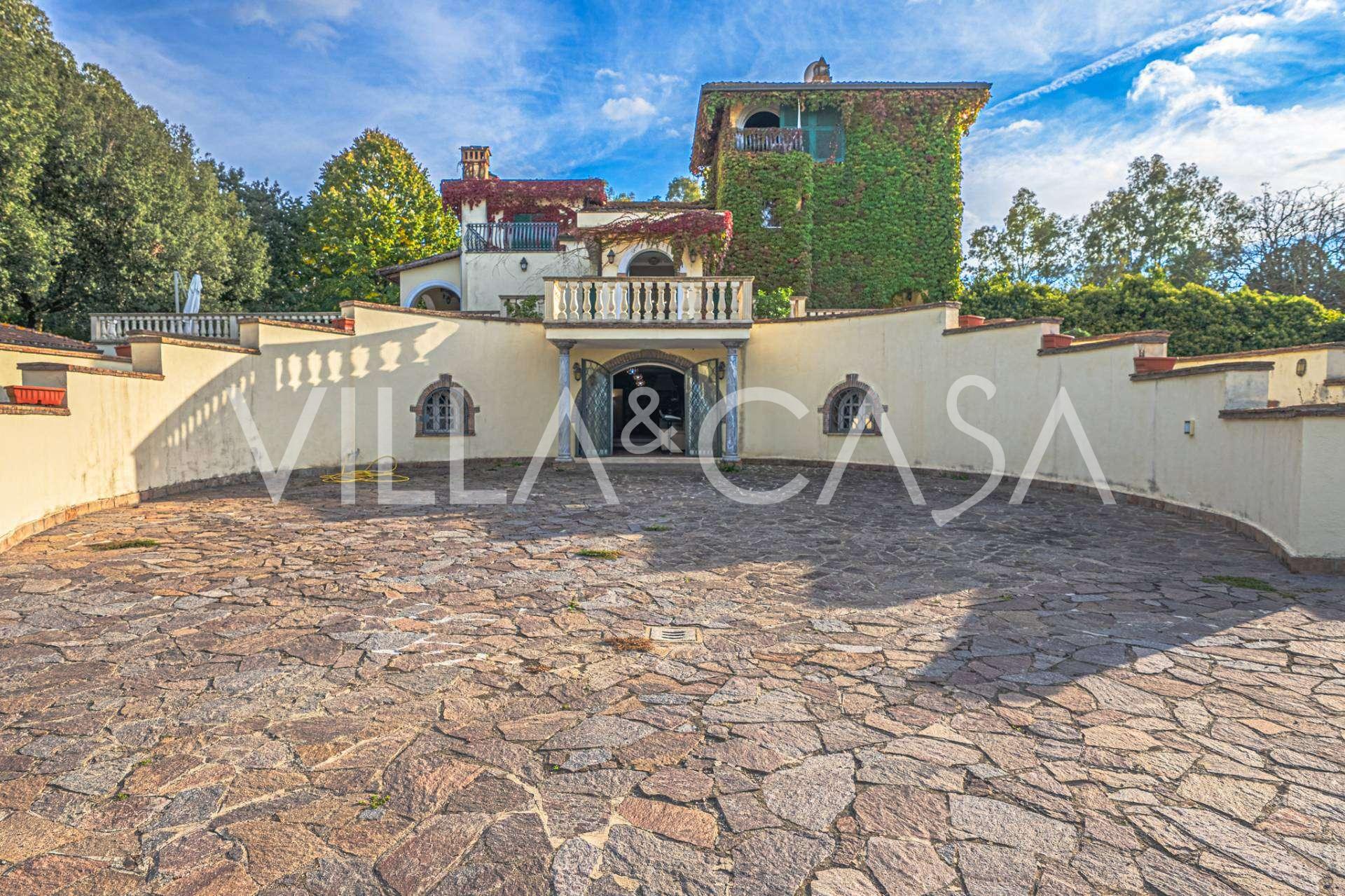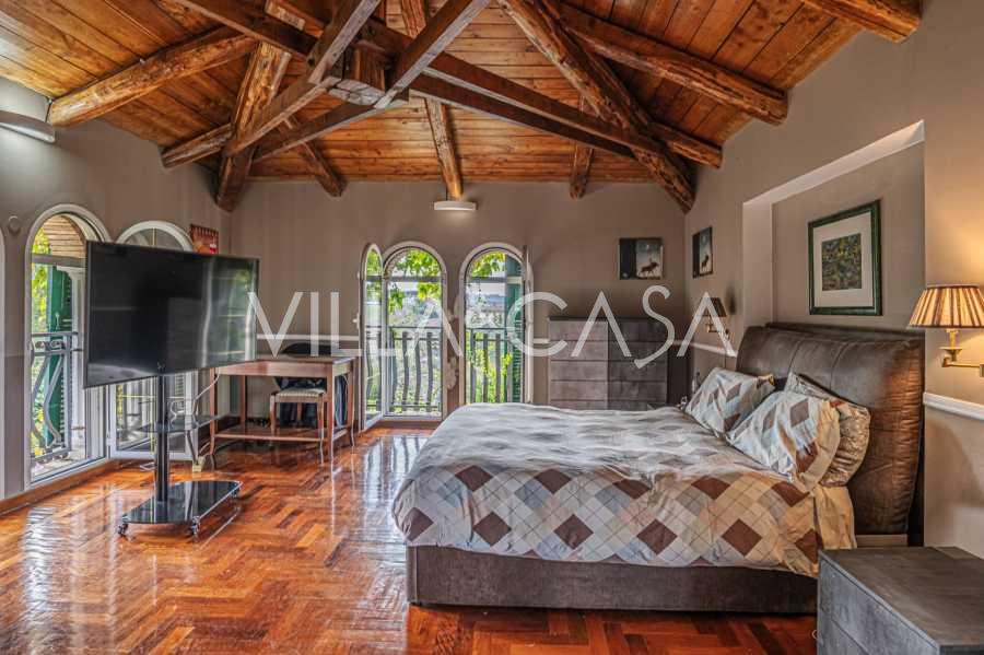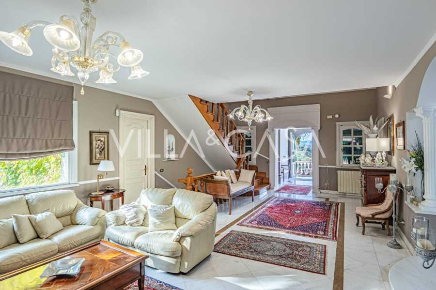La villa si eleva su quattro piani, sorprendendo con la sua architettura ben studiata e il design elegante degli interni. Un maestoso cortile d'onore con scale simmetriche conduce all'ingresso principale, aprendo uno spazio dove ogni elemento è creato per il comfort e il piacere. Al primo piano, gli ospiti vengono accolti da una lussuosa zona reception con l'atmosfera di un palazzo privato: un ampio soggiorno con camino, un raffinato studio e una elegante camera per gli ospiti con bagno creano un'armonia di comfort e nobiltà.