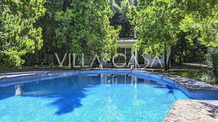 In vendita una elegante villa di fine XIX secolo con architettura eclettica, che combina abilmente stili coloniali, classici e moderni. Situata su un terreno di parco di oltre 4000 metri quadrati, piantumato con piante pregiate, la proprietà include una piscina e una dependance di circa 100 m2.
