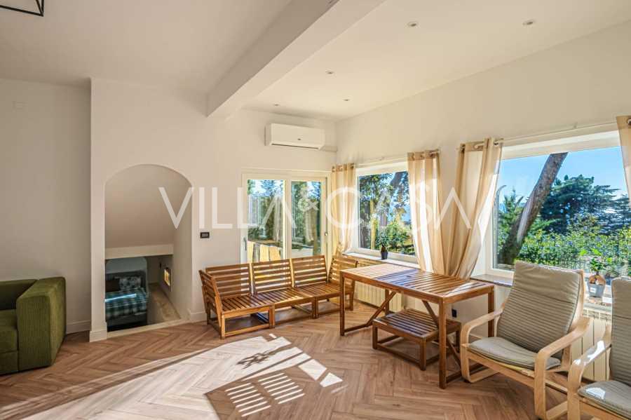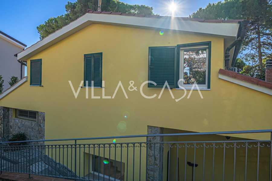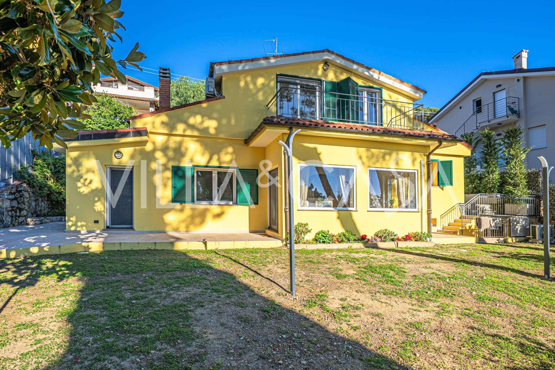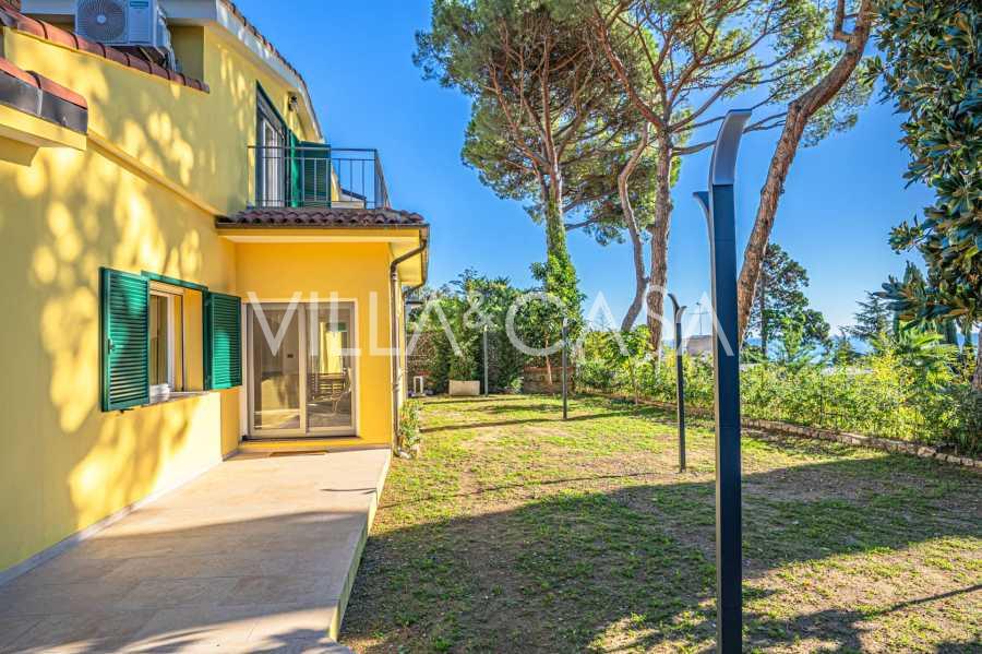La proprietà della villa è immersa nel verde: un giardino curato con piante decorative e fiori, una zona relax all'aperto e un parcheggio privato per tre auto. Una recente ristrutturazione ha aggiunto modernità e freschezza alla casa, mantenendo al contempo l'eleganza mediterranea.