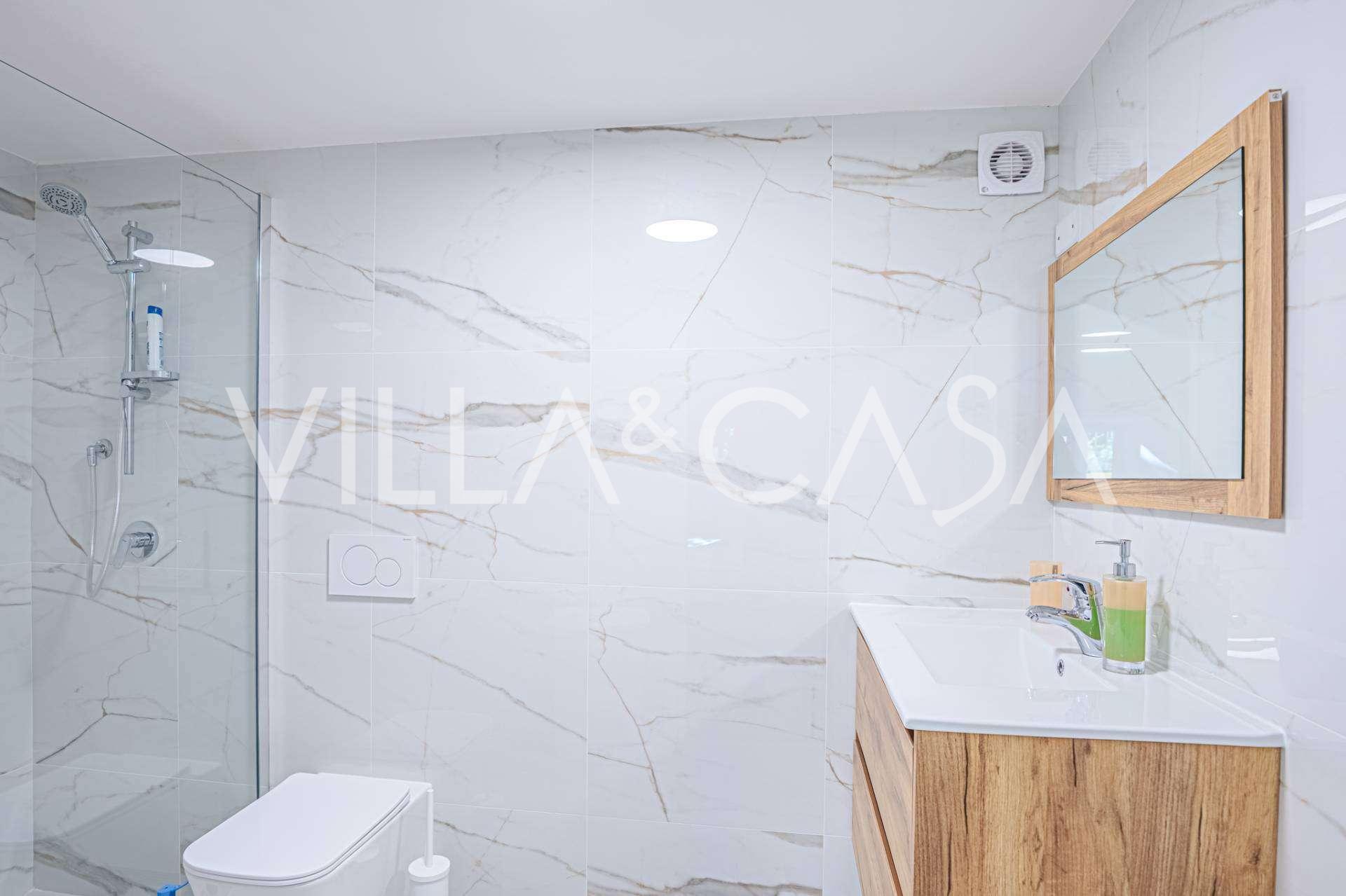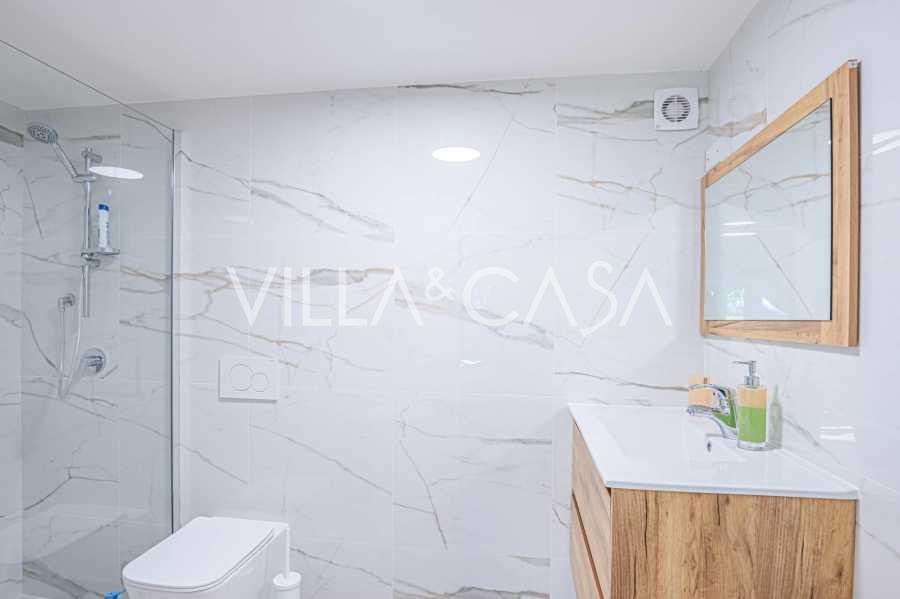 Al livello principale, gli ospiti vengono accolti da un luminoso e spazioso ingresso con vista sul mare. L'elegante soggiorno, inondato di luce naturale, ha accesso al giardino e alla terrazza, ideale per il relax e per ricevere ospiti. La cucina separata è realizzata in stile moderno e completamente attrezzata. A questo livello si trovano anche un elegante bagno e un incantevole portico, perfetto per pranzi all'aperto con vista sul mare.
